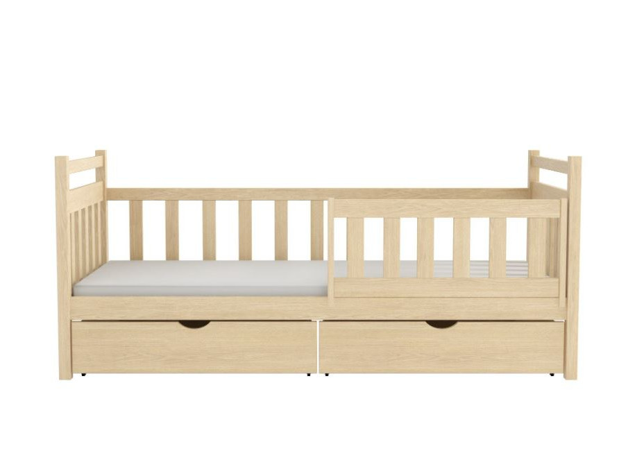 Natálie je klasická jednolůžková postel, která se bude dobře vyjímat v každém dětském pokojíčku. Konstrukce z borovicového dřeva je pevná a odolná a minimalistický vzhled zapadne téměř do každého interiéru. Jednoduchá konstrukce jde ruku v ruce s velmi vysokou odolností a nosností, díky čemuž postýlka bez problémů odolá i dětským hrám. U bočnic a čel je šířka použitého materiálu 2,6 cm. Postel je pokryta lakem na vodní bázi, který nenese riziko zdravotních problémů. Bezpečnost dětí během spánku zajišťuje ochranná bariérka s univerzální možností montáže na pravou i levou stranu postele. Součástí postele jsou dva prostorné šuplíky, které slouží k uložení lůžkovin a hraček a pevný laťkový rošt.