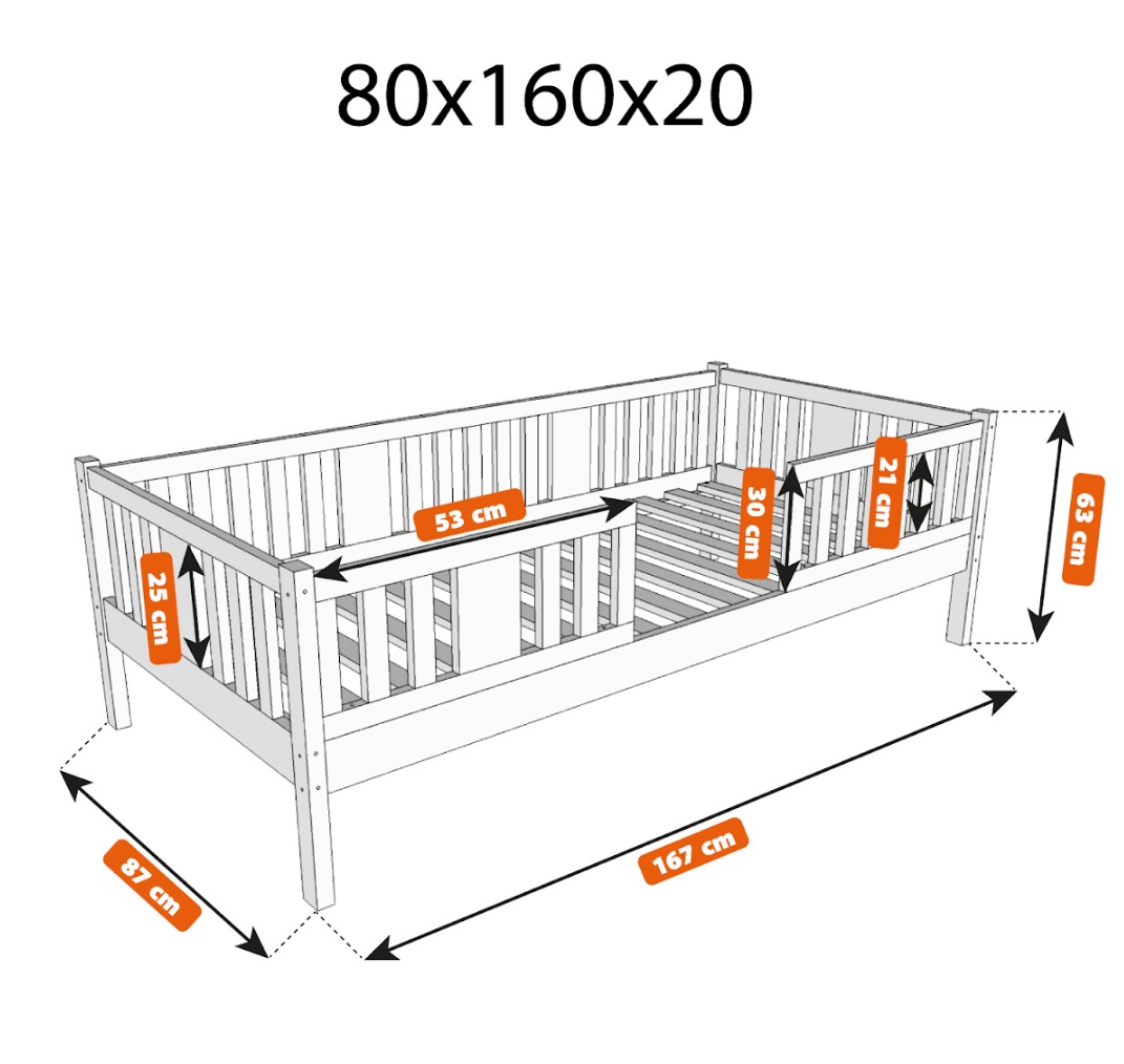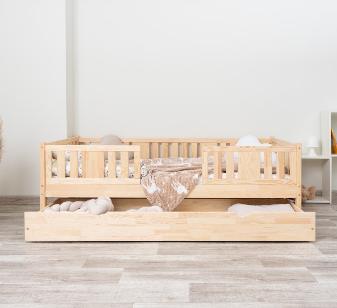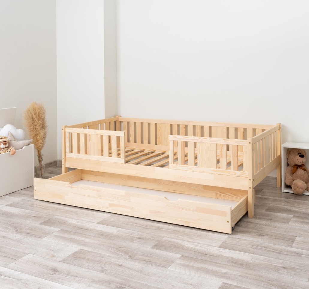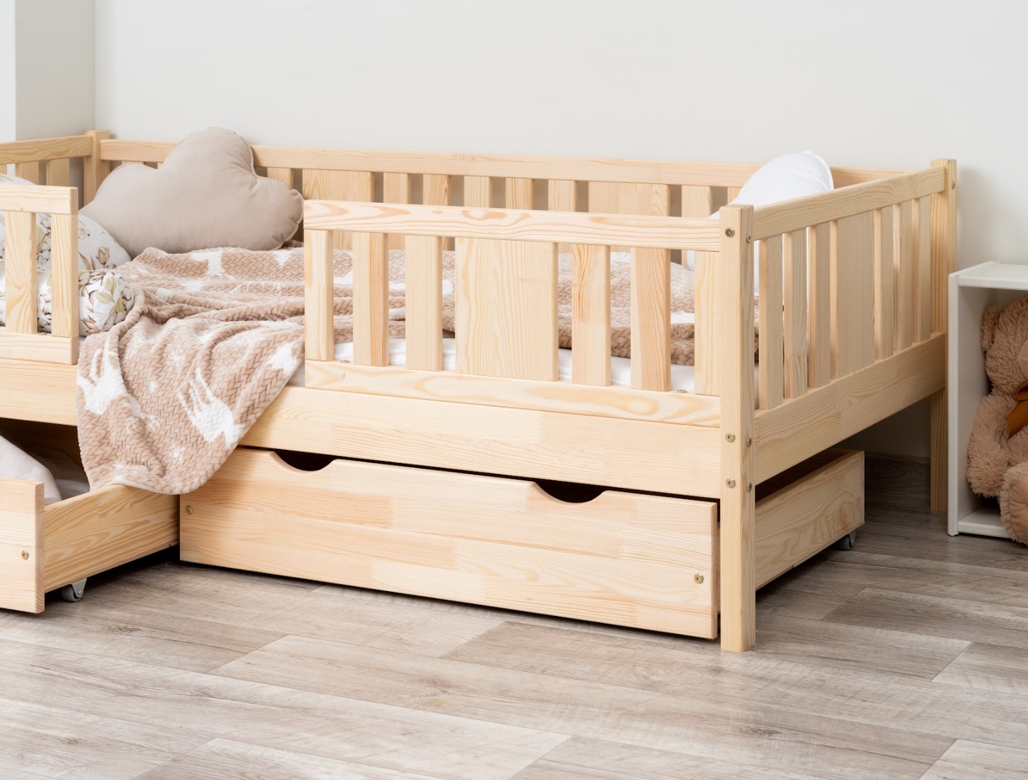 NIKO 20 cm je robustní a esteticky příjemná dětská postel, vyrobená výhradně z přírodního borovicového dřeva. Rám, zvýšený o 20 cm, dodává její praktičnosti nový rozměr – volitelnou zásuvku pod postelí lze využít na ložní prádlo, hračky nebo dokonce jako přistýlku pro druhé dítě. Tento model kombinuje skandinávský styl, odolné dřevo a chytrá řešení pro moderní rodinné interiéry. Každý prvek postele NIKO 20 cm je vyroben z lepeného borovicového dřeva, které je ceněno pro svou odolnost, stabilitu a přírodní vzhled. Dřevo je pečlivě broušeno a hrany jsou jemně zaoblené, takže je zcela bezpečné pro nejmladší uživatele. Pro povrchovou úpravu byly použity ekologické barvy na vodní bázi, které splňují bezpečnostní normy. Postel nabízíme také ve verzi bez povrchových úprav - nelakované dřevo. Díky tomu ji lze snadno přizpůsobit - její vzhled můžete upravit mořením, lakováním nebo malováním dle vlastního uvážení. Každý prvek rámu byl precizně vyleštěn a hrany jsou jemně zaoblené, aby bylo zajištěno maximální pohodlí a bezpečnost. Bezpečnostní zábrany u vstupu do postele jsou odnímatelné.