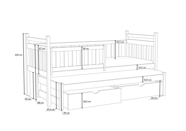 Jednoduchá a solidně vyrobená postel s přistýlkou Prokop skvěle doplní dětský pokoj a dodá mu jedinečné útulné kouzlo v minimalistickém provedení. Zábrany jsou navrženy tak, aby poskytovaly vašemu nejmenšímu maximální bezpečí. Možnost vysunutí přistýlky je perfektní, pokud chcete spát v jeho blízkosti nebo pokud máte dvě děti sdílející pokoj. Postel Prokop nabízí funkční řešení, které vám umožní ušetřit spoustu místa v dětském pokoji. Dvě hluboké zásuvky usnadní udržování pořádku a rozkládací postel je navržena tak, aby poskytovala pohodlí oběma osobám používajícím postel, ať už se jedná o sourozence, kamaráda nebo návštěvu. Vysoké opěrky hlavy a odnímatelná bezpečnostní zábrana účinně ochrání dítě před pádem. Postel je vyrobena z kvalitního masivního borovicového dřeva. U bočnic a čel je šířka použitého materiálu 2,6 cm. Poskytuje vysokou nosnost a odolnost proti poškození, díky čemuž je postel Prokop investicí na mnoho let. Postel je ošetřena ekologickým lakem na vodní bázi, který postel chrání před poškozením a poškrábáním. Postel je dodávána včetně kvalitních roštů.