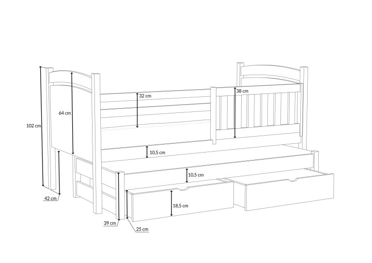 Dětská postel SABINA v sobě kloubí moderní design a pohodlí a poskytne vašemu dítěti pohodlí při spánku. Na výsuvné přistýlce může spát druhé dítě, rodič nebo host, který u vás doma zůstane přes noc. Čela postele jsou osazena bílými deskami stíratelnými za sucha, které dítě může vyzdobit a dát tak originální šmrnc posteli i celému pokoji. Postel Sabina má také dva prostorné šuplíky, do kterých lze uložit lůžkoviny, oblečení nebo hračky dítěte a usnadňují tak udržování pořádku v dětském pokoji. Skvěle se bude hodit i do sdíleného pokoje mezi sourozenci, kde pomáhá ušetřit mnoho místa. Postel je vyrobena z masivního borovicového dřeva, které zajišťuje odolnost konstrukce a hypoalergenní lak na vodní bázi postel chrání před poškozením a poškrábáním. U bočnic a čel je šířka použitého materiálu 2,6 cm. Součástí postele je také odnímatelná ochranná bariérka, která chrání dítě proti možným pádům. Postel je dodávána včetně kvalitních roštů.