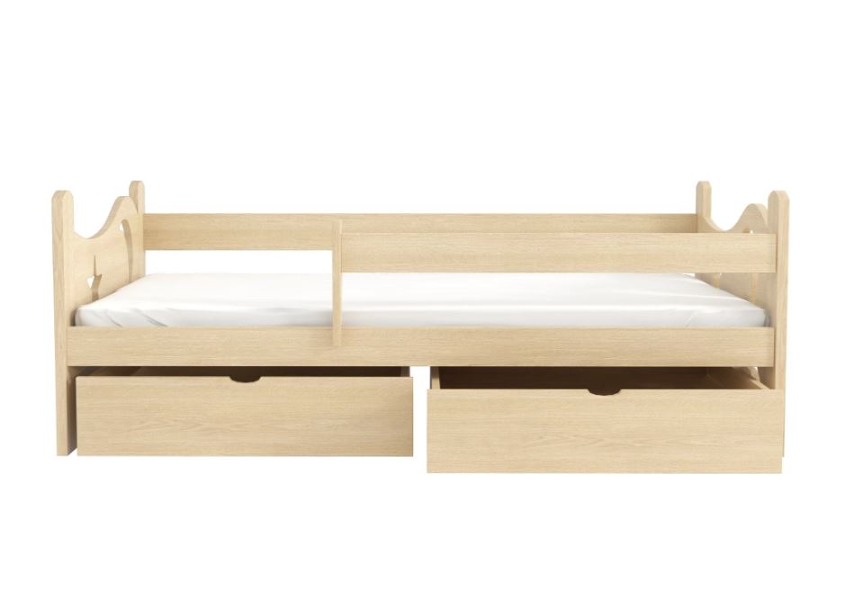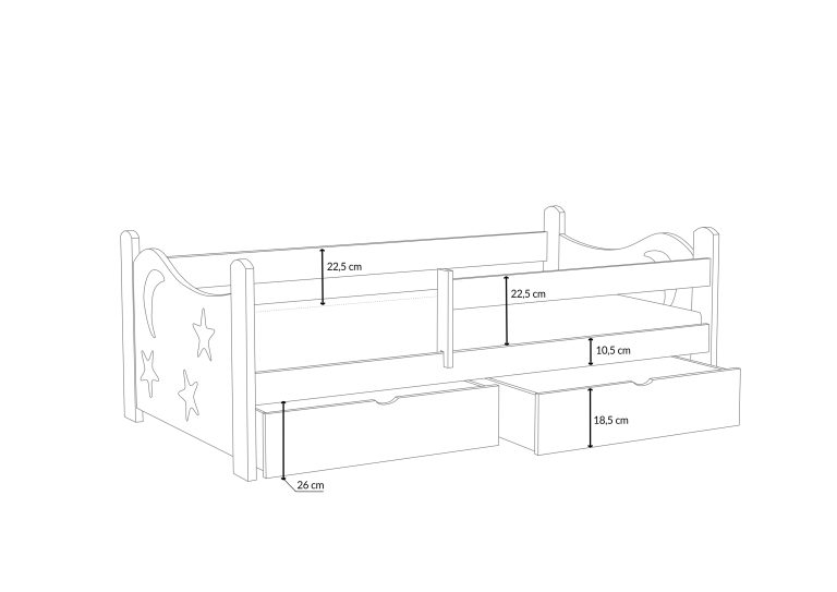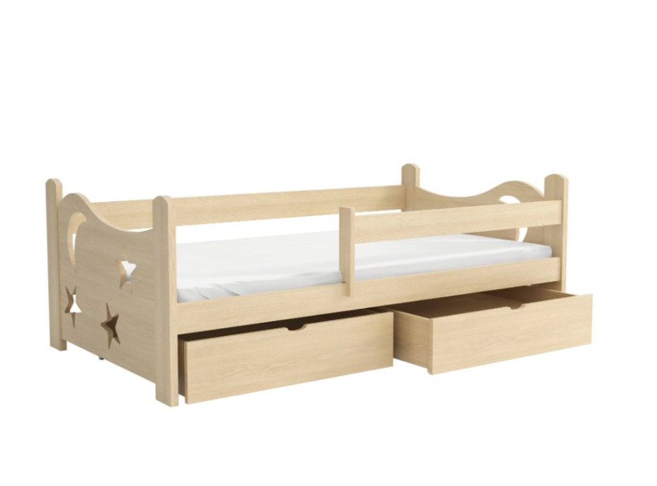 Jednolůžková postel STARS vyniká nejen svým krásným vzhledem, ale také nepopiratelným komfortem, který poskytuje. Díky posteli Stars se pokoj vašeho dítěte stane opravdu kouzelným! Stars je prostorná jednolůžková dřevěná postel, jejíž klasický styl s nádechem působivého designu potěší všechny děti. Originální výřezy ve tvaru měsíce a hvězd na rámu postele jsou ozdobou do dětského pokoje, která podnítí jejich fantazii. Hluboké a prostorné šuplíky ve spodní části postele Stars jsou perfektní jako funkční úložné prostory, které usnadňují udržování pořádku a čistoty v dětském pokoji. Postel Stars je kombinací nadčasové jednoduchosti a jedinečného designu. Jednolůžková postel Stars je vyrobena z nejkvalitnějšího masivního borovicového dřeva ošetřeného zdravotně nezávadným lakem na vodní bázi, který je zcela bez zápachu a neobsahuje žádné škodlivé látky. U bočnic a čel je šířka použitého materiálu 2,6 cm. Bezpečnost dětí během spánku zajišťuje ochranná bariérka s možností univerzální montáže na pravou i levou stranu. Součástí postele je také pevný laťkový rošt. Přírodní materiály použité k výrobě postel Stars zajišťují správný vývoj dítěte a nadčasový design umožňuje zařídit krásný dětský pokoj v klasickém stylu.