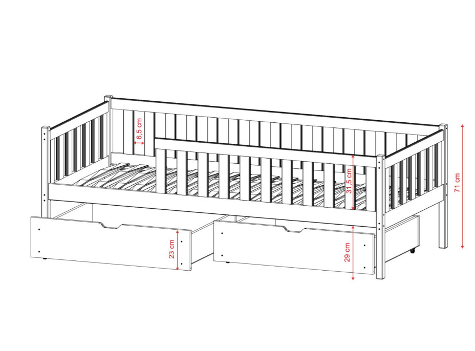 Dětská postel z masivu borovice TONY patří mezi dětské postele, které se vyznačují jednoduchým designem. Postel je pečlivě vyrobená, má pevnou konstrukci a je propracována do posledního detailu. Borovicové dřevo, které se k její výrobě používá, je té nejvyšší kvality. Postel je odolná proti poškrábání a to díky třem vrstvám ekologického laku s certifikací EN 71-3 : 2013. Lak je bez zápachu a vyznačuje se vynikající světlostálostí. Konstrukce postele je uzpůsobena tak, aby zabránila pádu dítěte, a to díky ochranným bariérám. Součástí postele je pevná ochranná bariéra, díky které je postel vhodná i pro nejmenší děti. Vaše dítě se tak bude cítit v klidu a bezpečí. Postel je dodávána včetně dvou prostorných šuplíků na kolečkách, do kterých můžete ukládat lůžkoviny nebo hračky. Čelo šuplíku i bočnice jsou vyrobeny z lamino desek s PVC úpravou. Dětská postel zaujme svým krásným vzhledem a vytváří tak komplexní prvek, který se bude vyjímat v každém dětském pokoji.