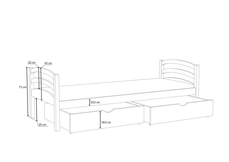 Postel Tornado se vyznačuje jednoduchou a lehkou konstrukcí, která je ale zároveň pevná a stabilní. Postel Tornado nezahltí dětský pokojíček a její skvělé zpracování z těch nejkvalitnějších materiálů zajistí, že bude sloužit dlouhá léta. Dřevěná postel z masivního borovicového dřeva se vyznačuje vysokou odolností proti poškození a nosností až 120 kg. U bočnic a čel je šířka použitého materiálu 2,6 cm. Má vysoké opěrky hlavy, speciálně zaoblené, aby byla zajištěna bezpečnost dětí, a dvě prostorné zásuvky, kam pohodlně uložíte lůžkoviny nebo hračky. Nábytek je pokryt ekologickým lakem na vodní bázi bez zápachu, který je zdravotně nezávadný. Součástí postele je také pevný laťkový rošt.