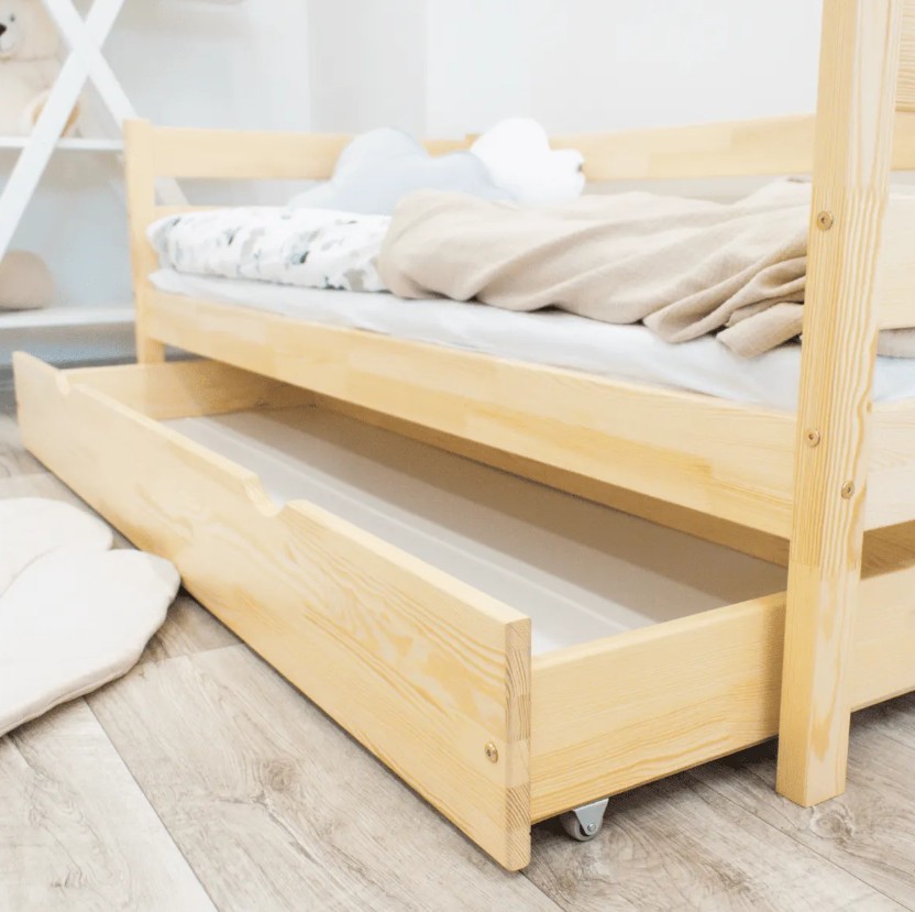 Tato dětská postel je vytvořena tak, aby ušetřila prostor v dětském pokoji. K posteli lze také dokoupit praktický a prostorný šuplík z masivu v několika variantách: