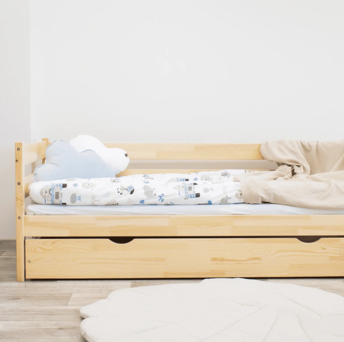 Tato dětská postel je vytvořena tak, aby ušetřila prostor v dětském pokoji. K posteli lze také dokoupit praktický a prostorný šuplík z masivu v několika variantách: