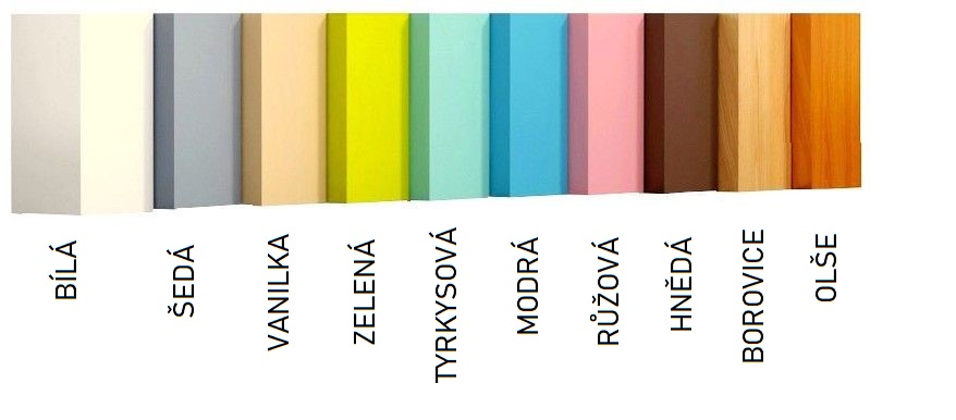 Pevná bezpečnostní zábrana a šuplíky budou automaticky dodány ve stejném barevném provedení jako zvolená postel.