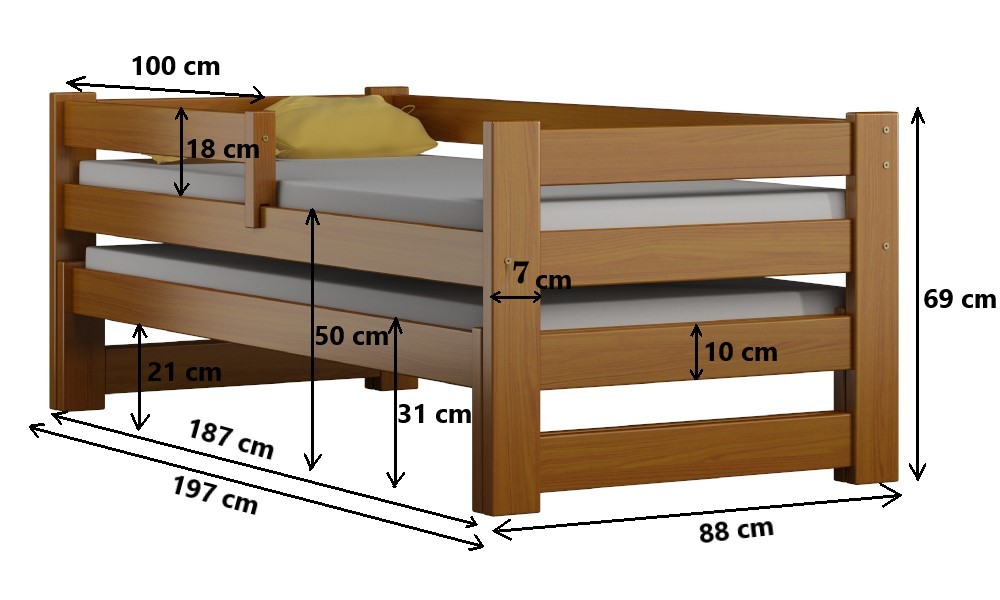 Postel je vyrobena z vysoce kvalitního borovicového dřeva se zvýšenou nosností až na 100 kg. Jedná se o dvojúrovňové lůžko, které lze během dne složit, což zvyšuje obytnou plochu pokoje. Konstrukce postele je uzpůsobena tak, aby zabránila pádu dítěte, a to díky ochranným bariérám. Vaše dítě se tak bude cítit v klidu a bezpečí. Ochranné bariéry, které jsou v ceně postele, obsahují jednu bariéru po celé délce postele a druhou kratší bariéru, kterou lze namontovat k čelu postele. Dětská postel zaujme svým krásným vzhledem a vytváří tak komplexní prvek, který se bude vyjímat v každém dětském pokoji.