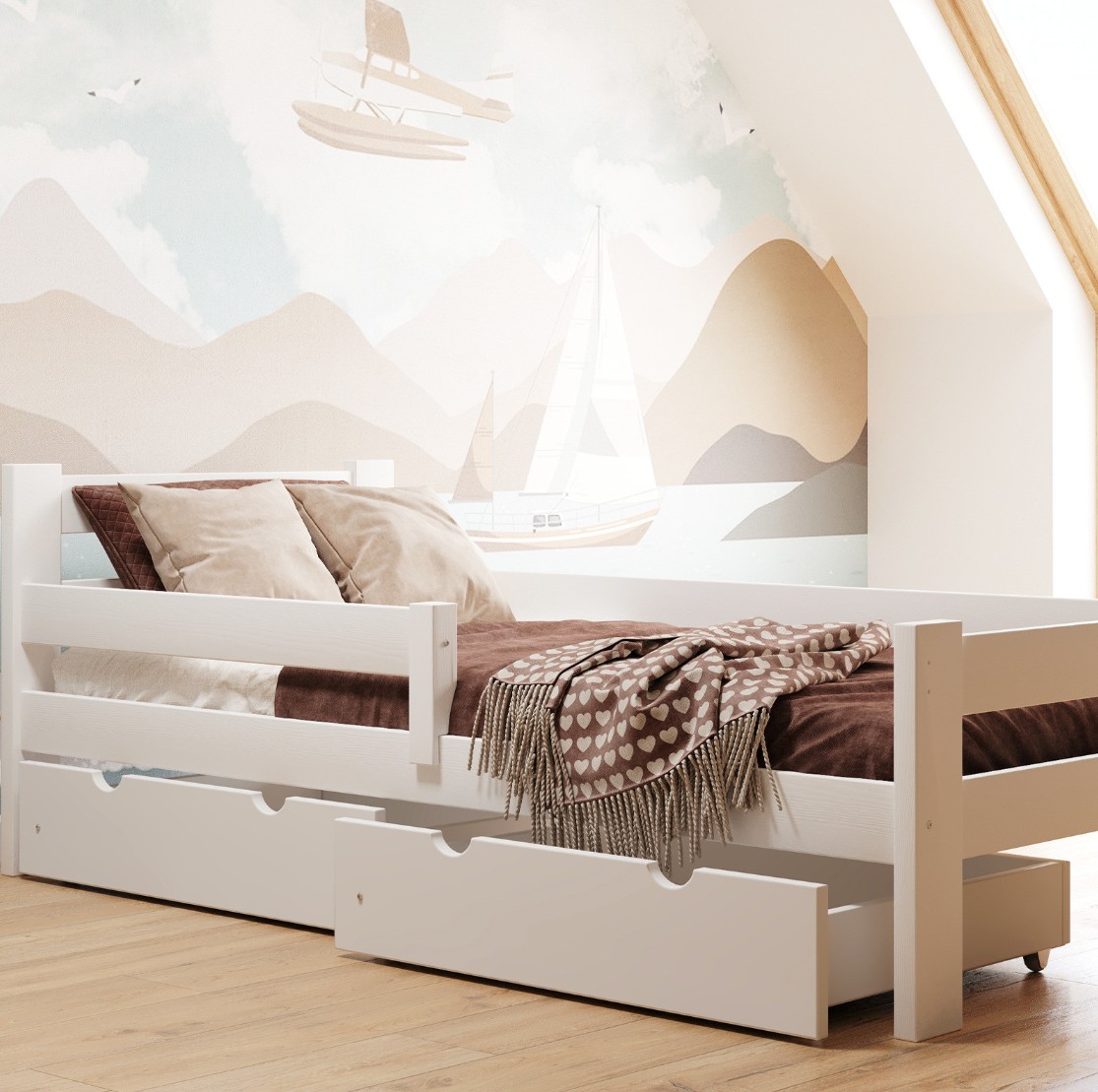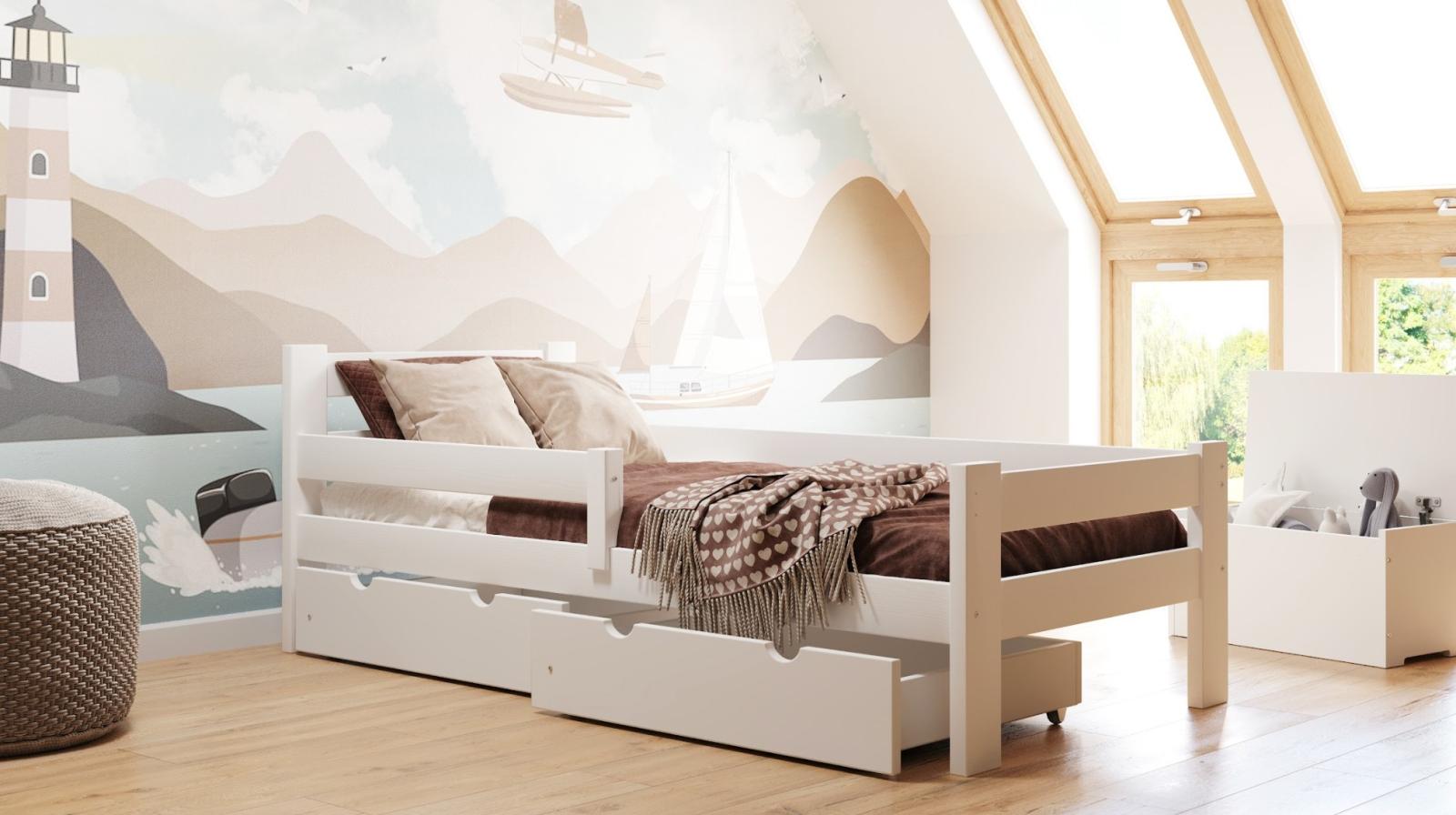 Pevná bezpečnostní zábrana a šuplíky budou automaticky dodány ve stejném barevném provedení jako zvolená postel.
