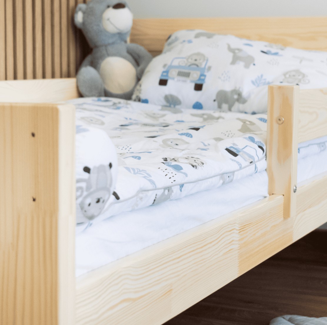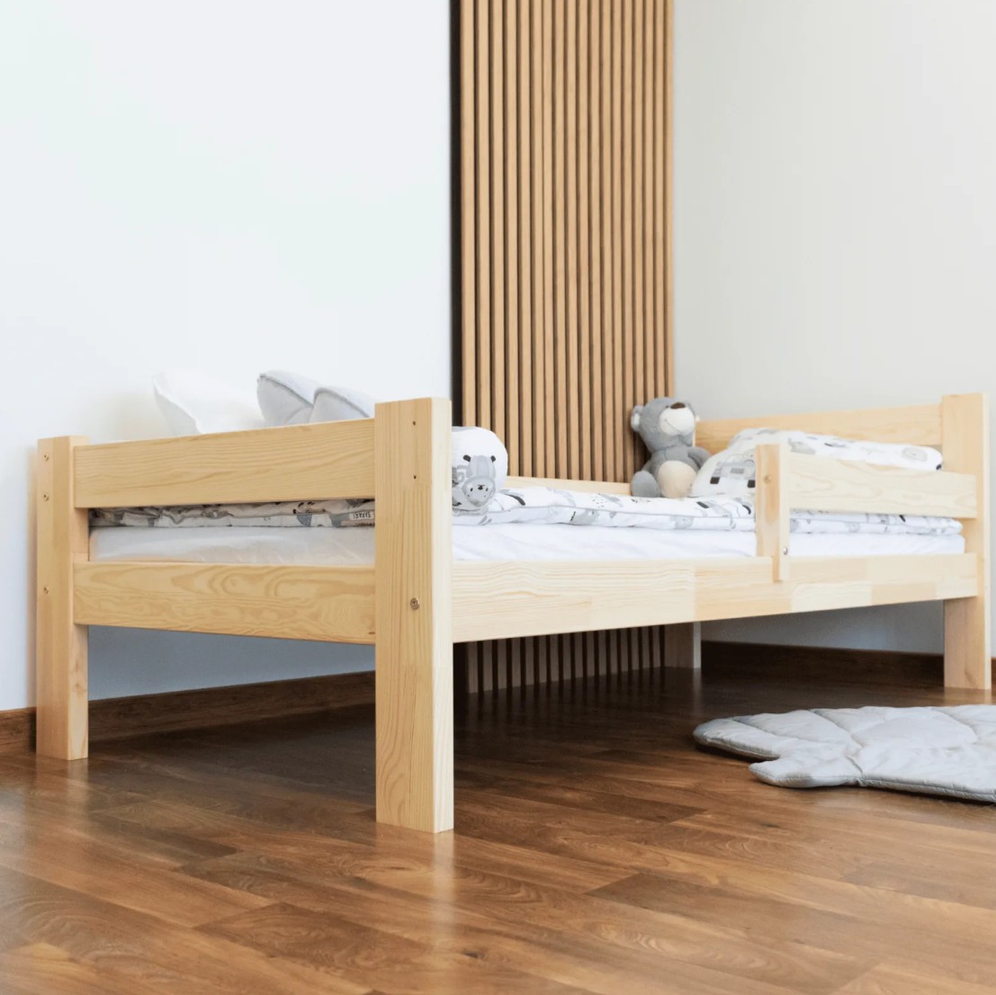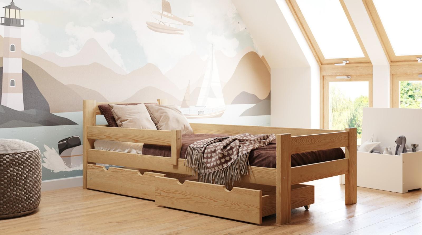 Postel je vyrobena z vysoce kvalitního borovicového dřeva se zvýšenou nosností až na 100 kg. Konstrukce postele je uzpůsobena tak, aby zabránila pádu dítěte, a to díky ochranným bariérám. Vaše dítě se tak bude cítit v klidu a bezpečí. Součástí postele je pevná ochranná bariéra, která lze namontovat k čelu postele jak z pravé strany, tak i z levé strany. Dětská postel zaujme svým krásným vzhledem a vytváří tak komplexní prvek, který se bude vyjímat v každém dětském pokoji.