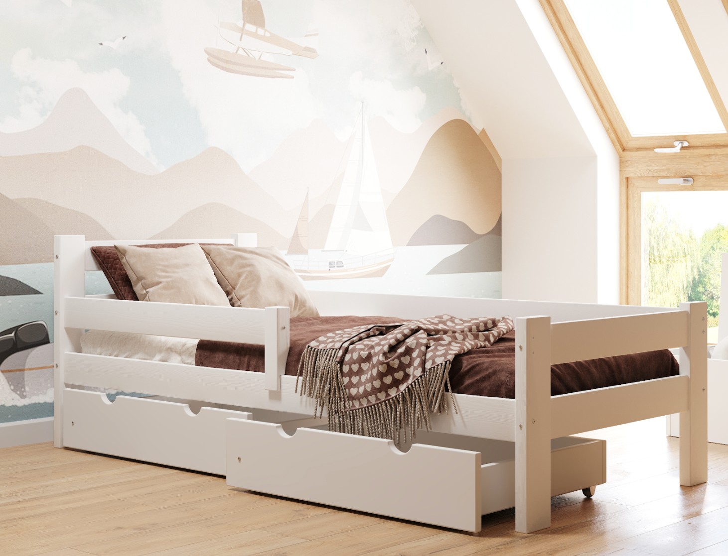 Pevná bezpečnostní zábrana a šuplíky budou automaticky dodány ve stejném barevném provedení jako zvolená postel.