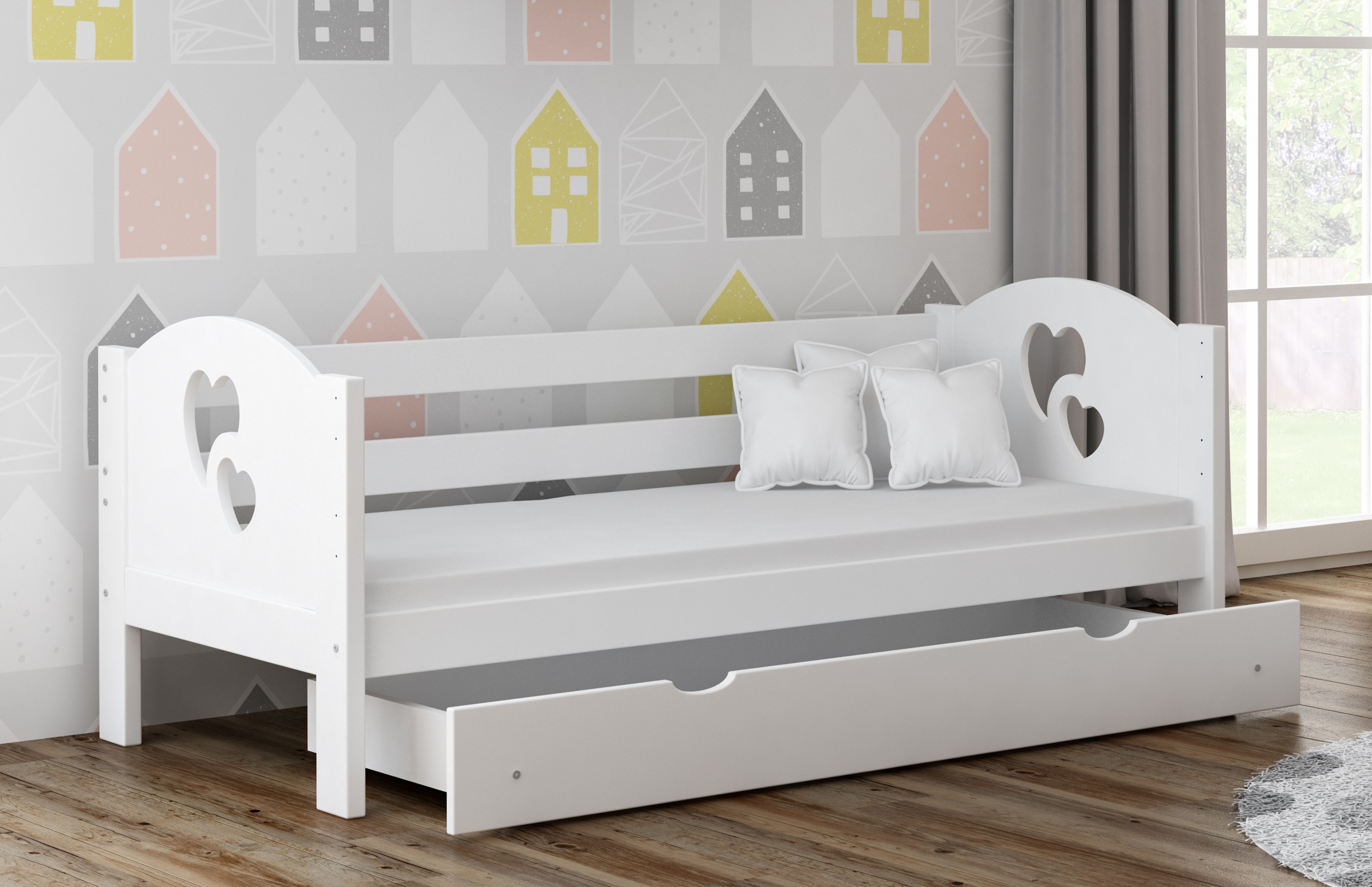 Postel je vyrobena z vysoce kvalitního borovicového dřeva se zvýšenou nosností až na 100 kg. Konstrukce postele je uzpůsobena tak, aby zabránila pádu dítěte, a to díky dlouhým ochranným bariérám, které jsou součástí postele. K posteli lze také přikoupit ještě jednu kratší odnímatelnou ochrannou bariéru, kterou můžete jednoduše připevnit po celé délce postele. Vaše dítě se tak bude cítit v klidu a bezpečí. Dětská postel zaujme svým krásným vzhledem a vytváří tak komplexní prvek, který se bude vyjímat v každém dětském pokoji.