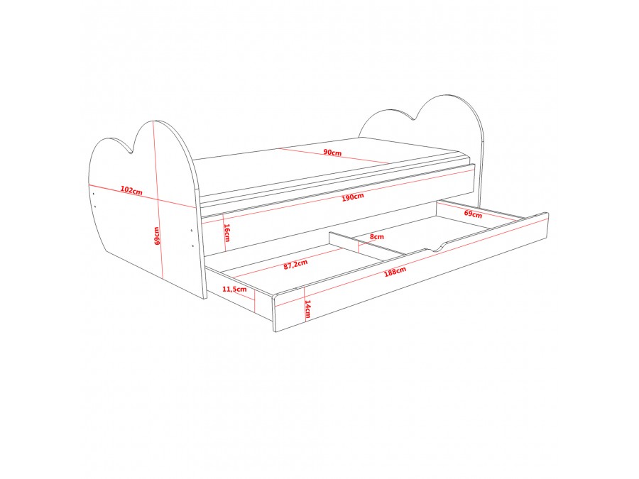Dětská postel z kolekce LOVE vás na první pohled zaujme unikátním srdíčkovým tvarem a moderním designem, který se hodí do každého dětského pokoje. Postele jsou vhodné jak pro děvčata, tak i chlapce a díky své univerzálnosti se hodí do každého dětského pokoje, kde se stanou hlavní dominantou interiéru.