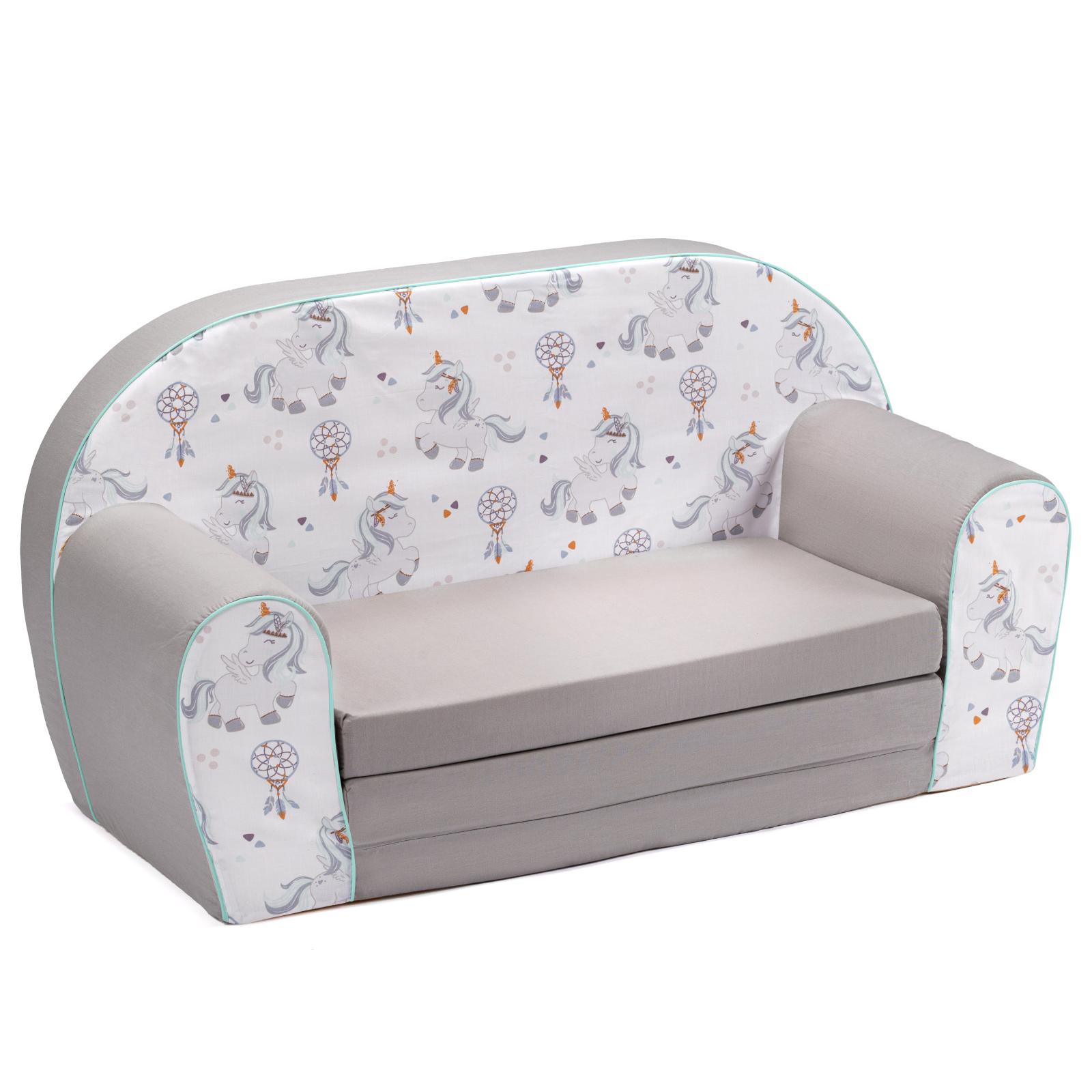 Dětská rozkládací MINI pohovka Jednorožci - bílá/šedá