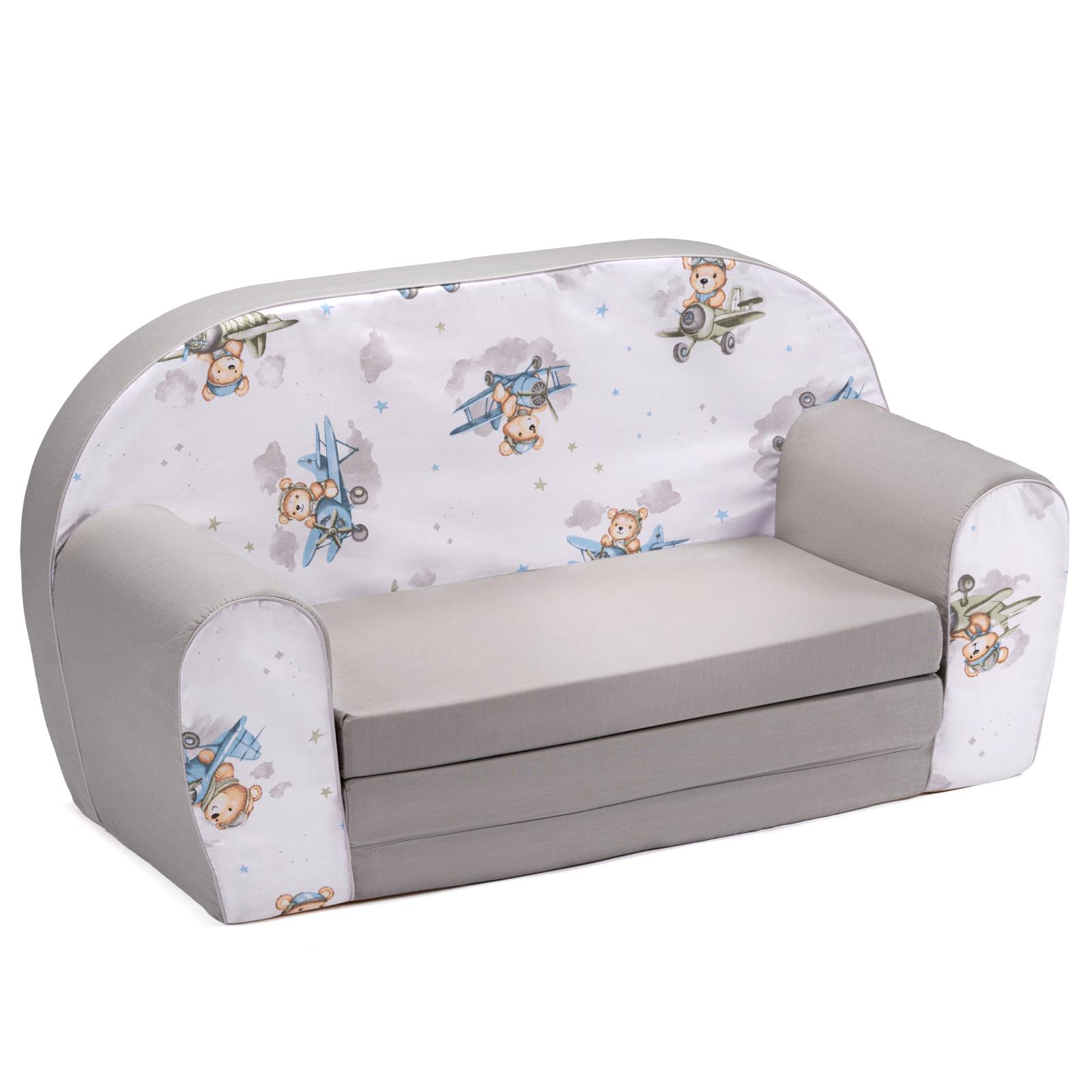Dětská rozkládací MINI pohovka Medvídek v letadle - bílá/šedá