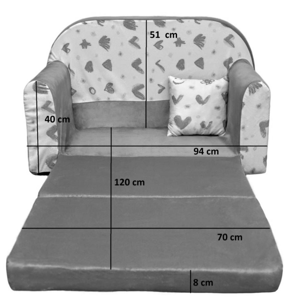 Rozměry rozložené pohovky: šířka 94 cm, výška 51 cm, délka 120 cm, výška opěrek 40 cm