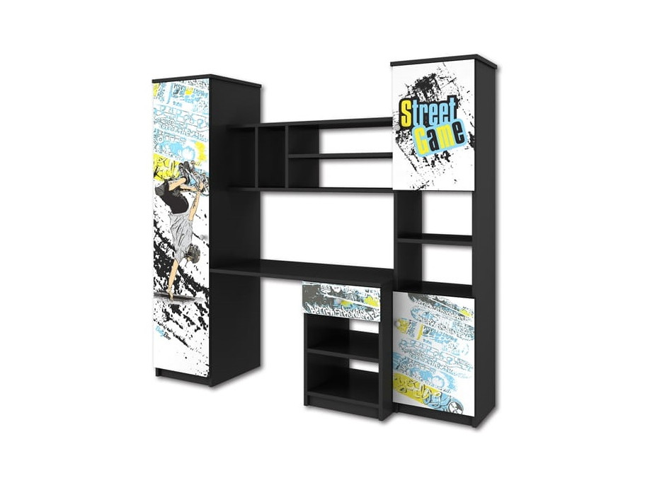 Dětská dřevěná stěna do pokoje je vyrobena z kvalitních MDF desek s dýhou. Přední části stěny mají barevný potisk v motivu skate, který je vyhotoven z ekologických barev naprosto bezpečných pro děti. Tisk má hezké syté barvy, které jsou zajištěny speciálním laminátem s ochranou proti oděru. Celou sestavu lze bez problému omýt navlhčeným hadříkem.