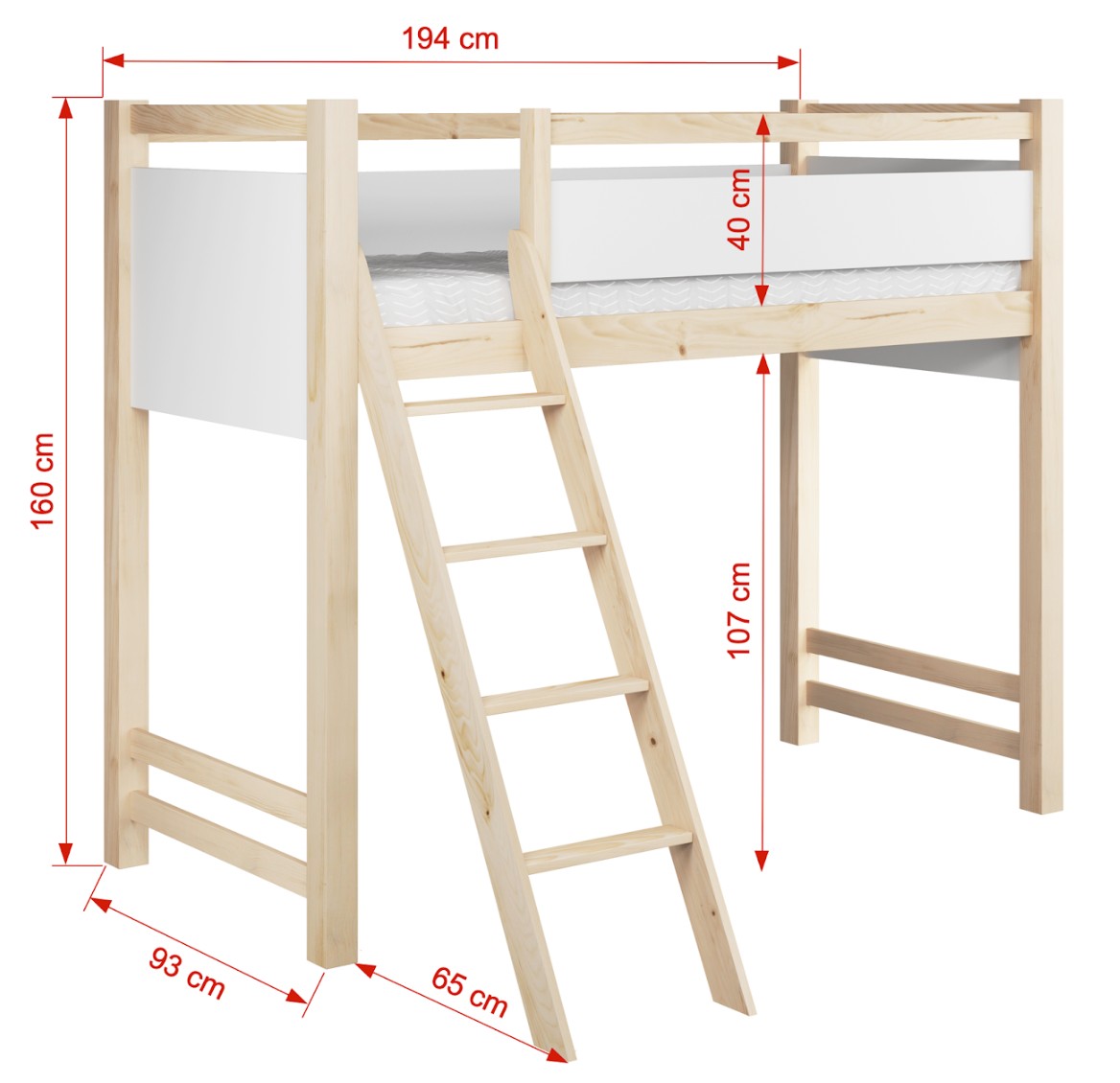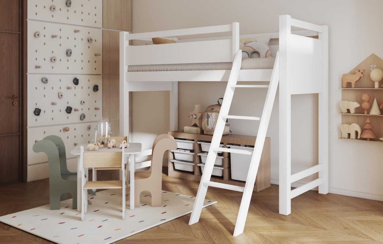Vyvýšená postel je k dispozici v různých velikostech, takže se snadno hodí do malých i větších místností. Nosnost až 100 kg činí tuto postel ideální nejen pro děti, ale i pro teenagery. Prostor pod postelí lze uspořádat libovolně – pro psací stůl, jako studijní kout, relaxační kout nebo úložný prostor. Toto moderní, praktické a odolné řešení roste s vaším dítětem a podporuje každodenní pohodlí během spánku, učení i hry.