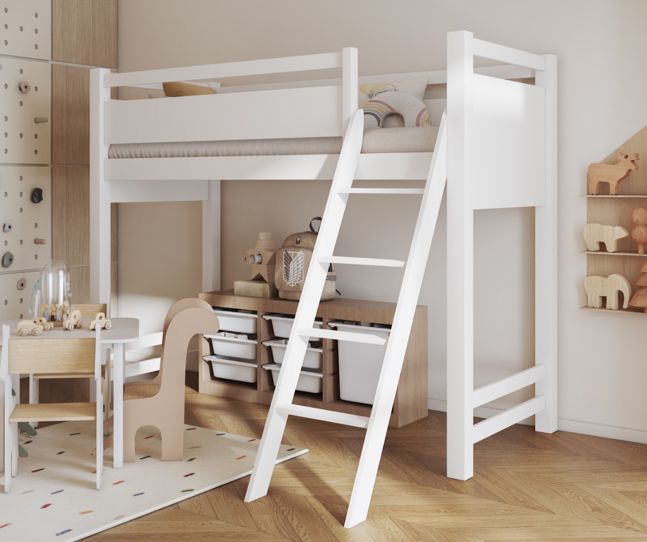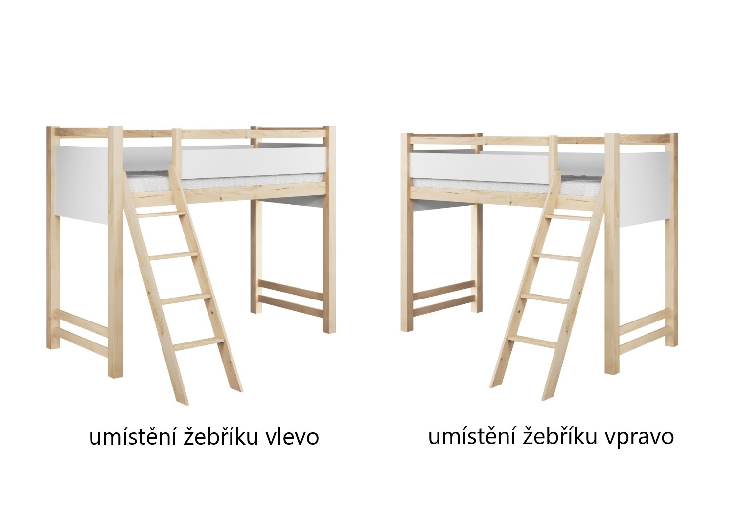 Vyvýšená postel VESPER je perfektním řešením pro dětské a teenagerské pokoje, kde je klíčový maximální prostor bez kompromisů v oblasti pohodlí nebo estetiky. Pevná hlavní konstrukce z přírodního borovicového dřeva zaručuje odolnost, stabilitu a bezpečnost. Borovicové dřevo je materiál ceněný pro svou pevnost, přírodní vzhled a dlouhou životnost. Dřevo je ošetřeno třemi vrstvami ekologického laku. Přírodní dřevo je kombinováno s nábytkovou deskou v bílé barvě, což vytváří harmonický vzhled. Tento model je vybaven šikmým žebříkem, který zajišťuje pohodlný a bezpečný vstup i pro menší děti. Toto řešení je mnohem ergonomičtější než tradiční vertikální žebříky.