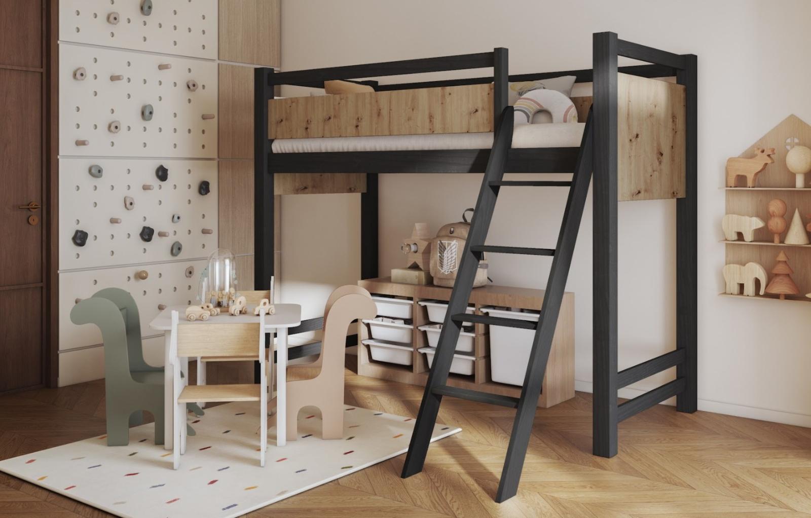 Vyvýšená postel VESPER je perfektním řešením pro dětské a teenagerské pokoje, kde je klíčový maximální prostor bez kompromisů v oblasti pohodlí nebo estetiky. Pevná hlavní konstrukce z přírodního borovicového dřeva zaručuje odolnost, stabilitu a bezpečnost. Borovicové dřevo je materiál ceněný pro svou pevnost, přírodní vzhled a dlouhou životnost. Dřevo je ošetřeno třemi vrstvami ekologického laku v tmavém odstínu wenge. Přírodní dřevo je kombinováno s nábytkovou deskou v dekoru dubu artisan, což vytváří velmi moderní a neotřelou kombinaci. Tento model je vybaven šikmým žebříkem, který zajišťuje pohodlný a bezpečný vstup i pro menší děti. Toto řešení je mnohem ergonomičtější než tradiční vertikální žebříky.