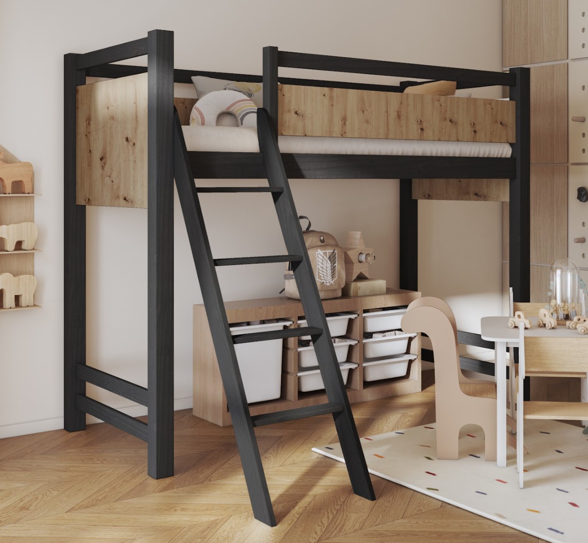 Vyvýšená postel je k dispozici v různých velikostech, takže se snadno hodí do malých i větších místností. Nosnost až 100 kg činí tuto postel ideální nejen pro děti, ale i pro teenagery. Prostor pod postelí lze uspořádat libovolně – pro psací stůl, jako studijní kout, relaxační kout nebo úložný prostor. Toto moderní, praktické a odolné řešení roste s vaším dítětem a podporuje každodenní pohodlí během spánku, učení i hry.
