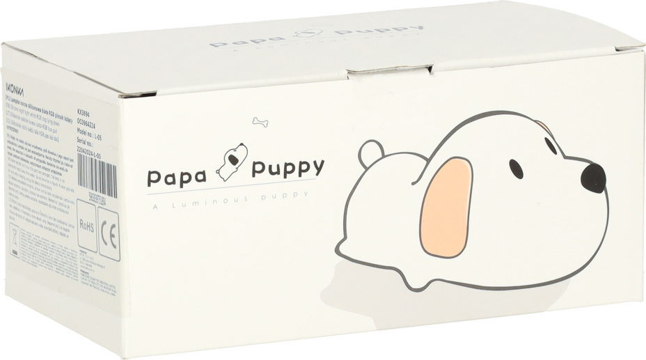 Toto noční světlo ve tvaru psa, vyrobené z měkkého silikonu, jemně osvětlí dětský pokoj. Je napájeno baterií s kapacitou 1200 mAh (součástí balení). Nabízí dva režimy svícení (teplá bílá a studená bílá), které vám umožňují přizpůsobit světlo vašim individuálním preferencím. Jas můžete upravit přidržením psa za čumák. Je také vybaveno 30minutovým a 50minutovým časovačem pro úsporu baterie. Součástí balení je nabíjecí kabel USB.