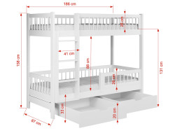 • Výška patrové postele se standardně pohybuje mezi 150–180 cm, což zajišťuje optimální vzdálenost mezi lůžky (70-112 cm). Je to ideální kompromis mezi dostatkem prostoru a bezpečností pro menší děti.