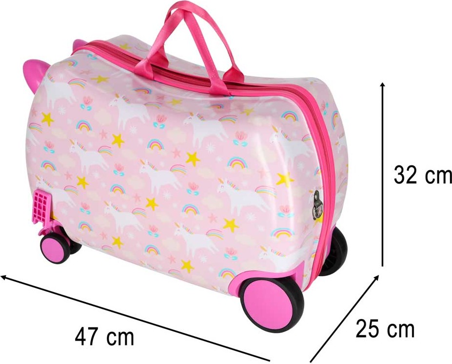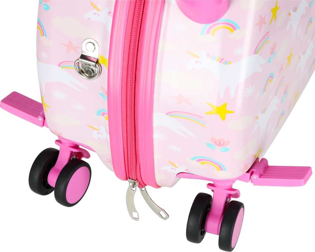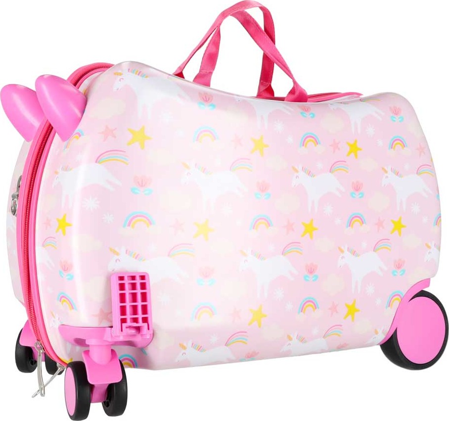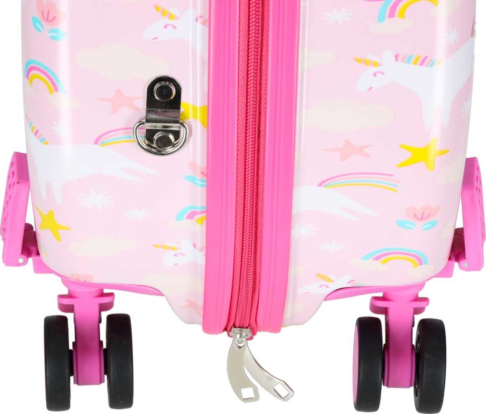 Tento dětský cestovní kufr v sobě spojuje lehkost, odolnost a design, který potěší nejmenší. Kufr s motivem jednorožce umožní nejmenším cestovat stylově. Díky čtyřem kolečkům se s ním snadno manipuluje, a to i při plném naložení. Uvnitř se nachází dvě velké přihrádky a kapsa na drobnosti. Unikátním prvkem jsou opěrky nohou, které umožňují unaveným dětem pohodlně se usadit na kufr a odpočinout si. Zapíná se na zip.