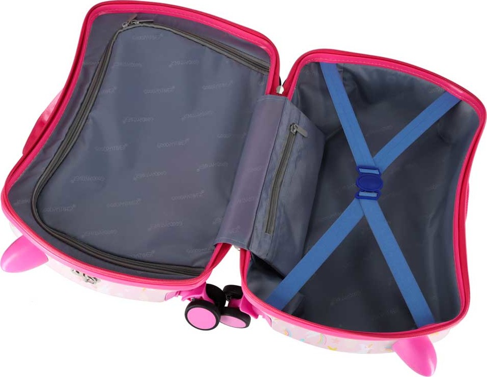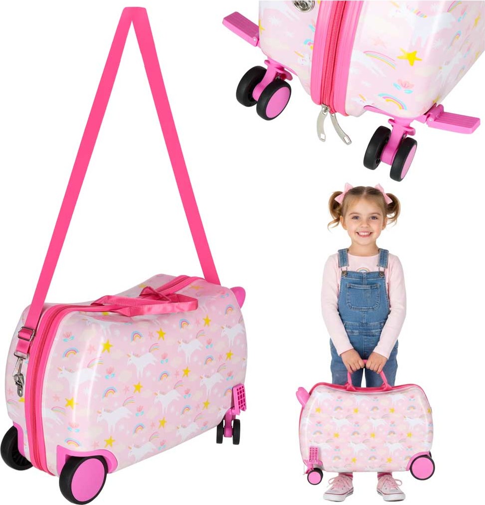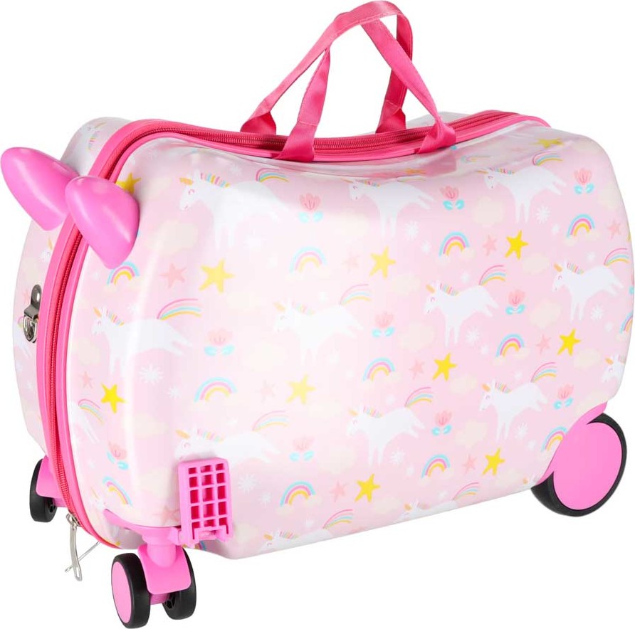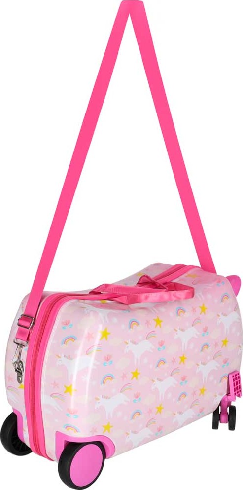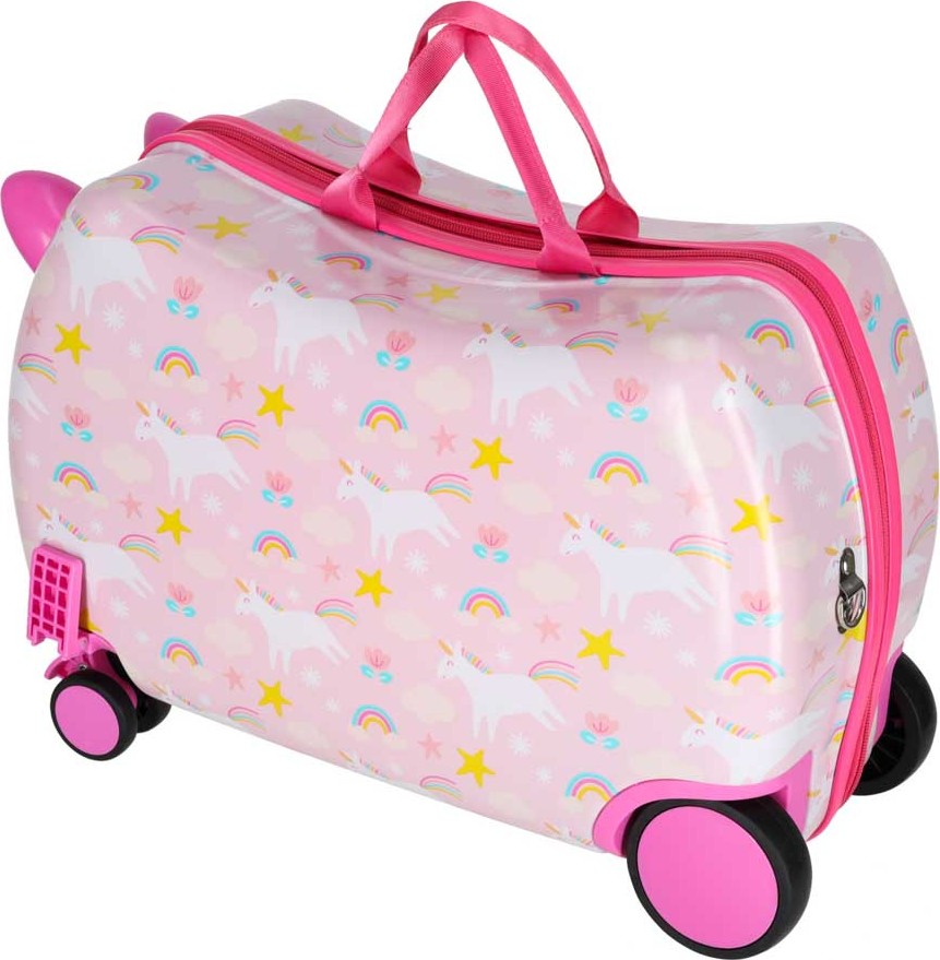 Tento dětský cestovní kufr v sobě spojuje lehkost, odolnost a design, který potěší nejmenší. Kufr s motivem jednorožce umožní nejmenším cestovat stylově. Díky čtyřem kolečkům se s ním snadno manipuluje, a to i při plném naložení. Uvnitř se nachází dvě velké přihrádky a kapsa na drobnosti. Unikátním prvkem jsou opěrky nohou, které umožňují unaveným dětem pohodlně se usadit na kufr a odpočinout si. Zapíná se na zip.