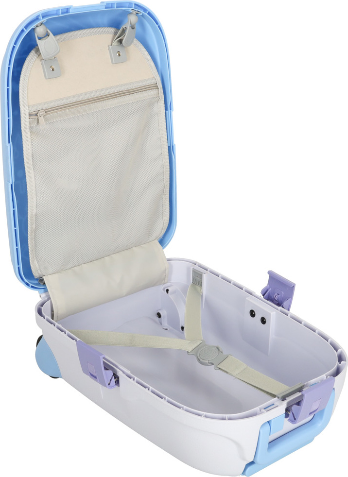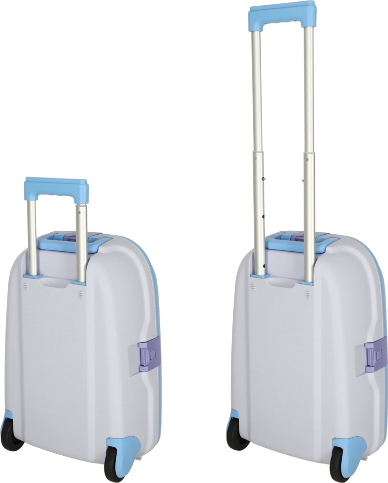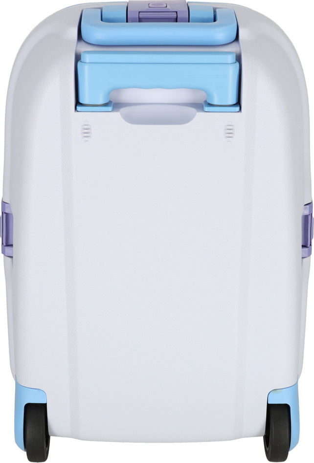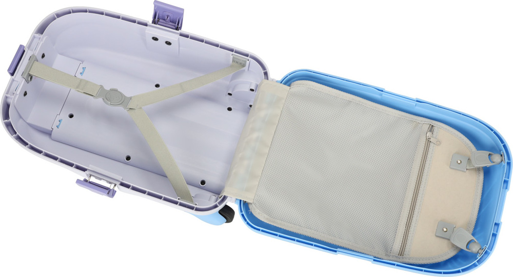 Tento modrý dětský kufr na kolečkách je ideální na jakýkoli výlet. Má výsuvnou hliníkovou rukojeť, která se přizpůsobí výšce dítěte. Zapíná se na tři patentky. Uvnitř jsou kompresní popruhy a kapsa na drobnosti. Kufr je lehký, takže ho děti snadno tahají. Má také překlopný stojan a gumová LED kolečka, která produkují minimální hluk.