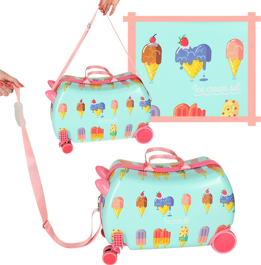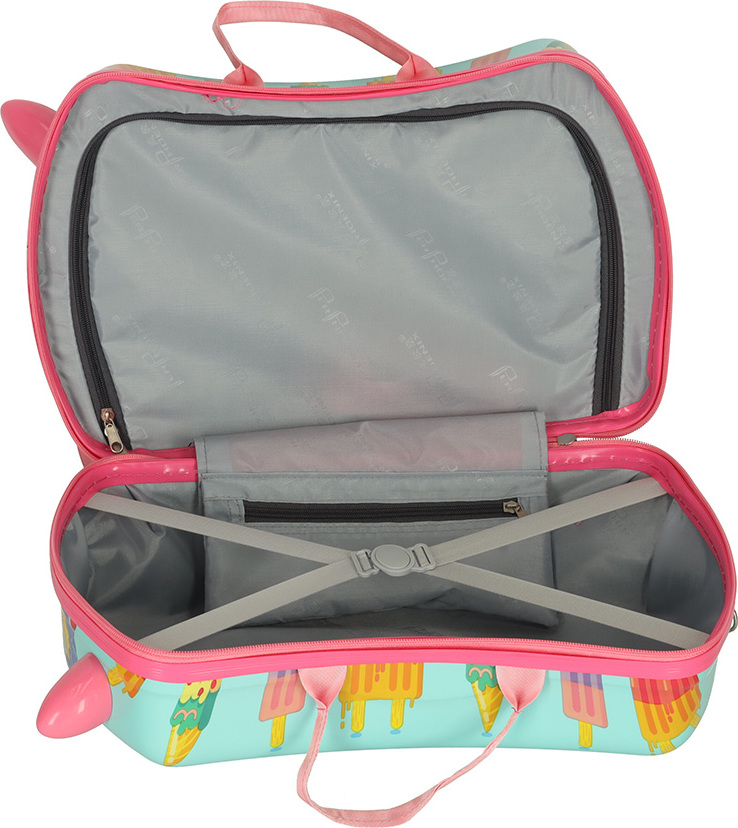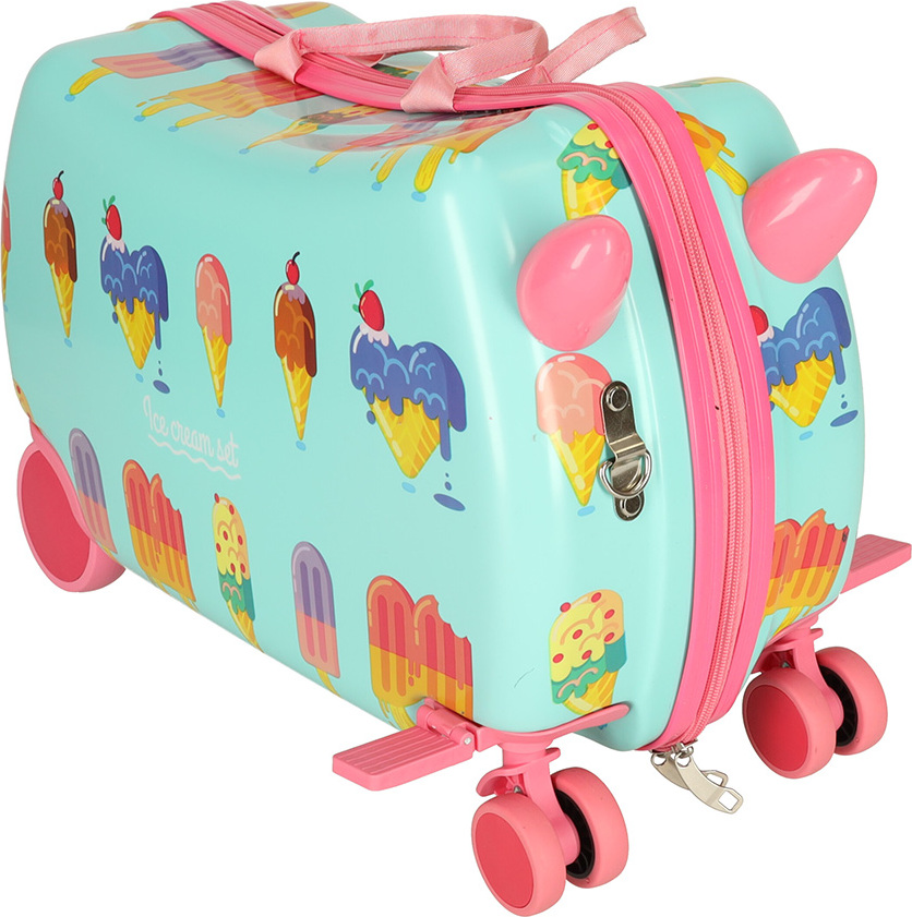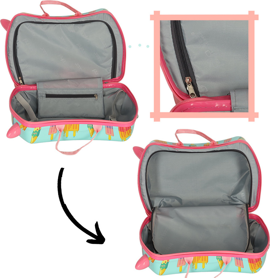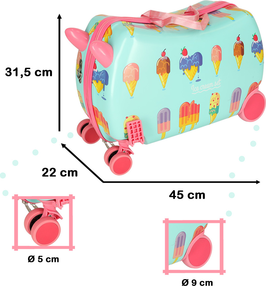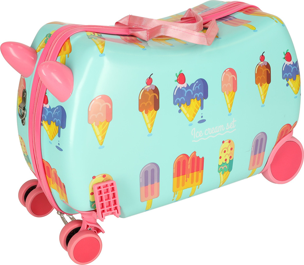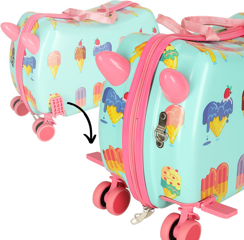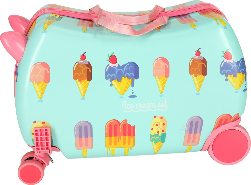 Tento dětský kufr s motivem zmrzliny umožní nejmenším cestovat stylově. Díky čtyřem kolečkům se s ním snadno manipuluje, a to i při plném naložení. Uvnitř se nachází dvě velké přihrádky a kapsa na drobnosti. Unikátním prvkem jsou opěrky nohou, které umožňují unaveným dětem pohodlně se usadit na kufr a odpočinout si. Zapíná se na zip.