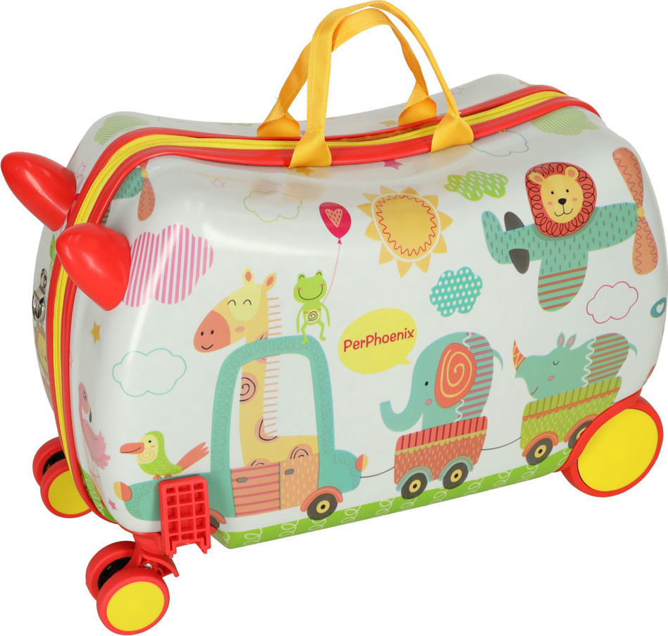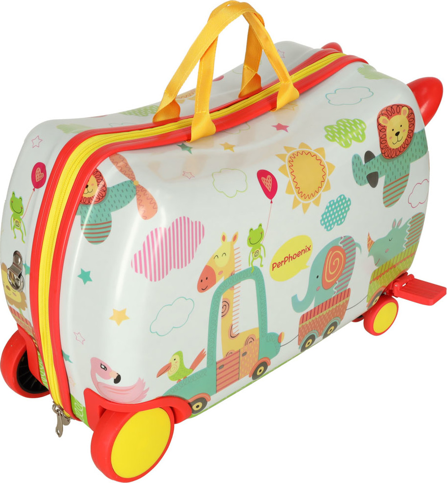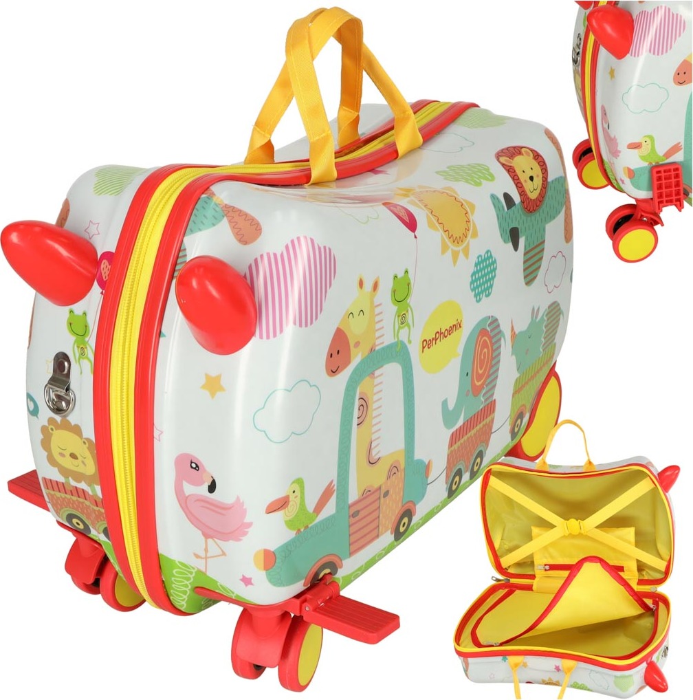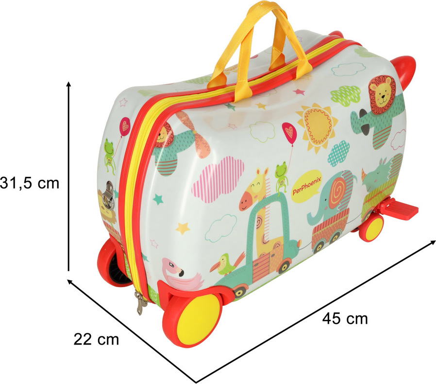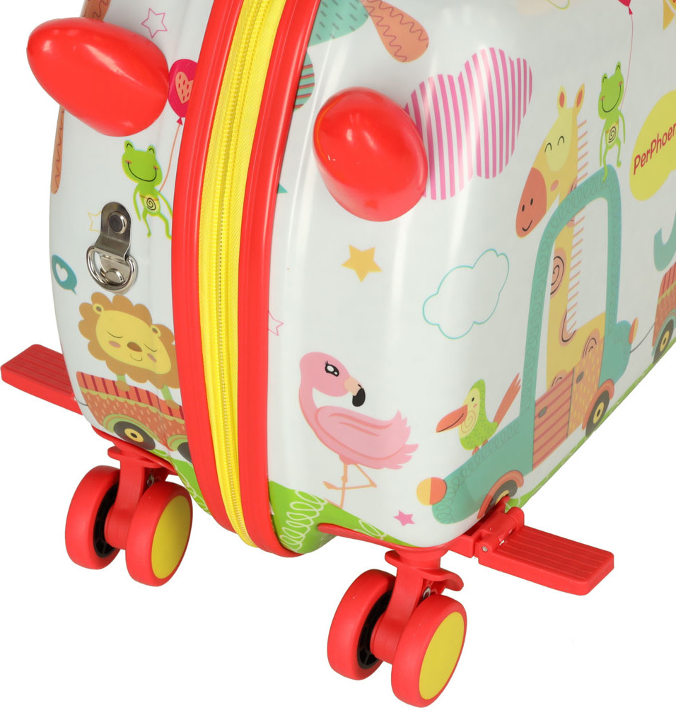 Tento dětský kufr s motivem zoo umožní nejmenším cestovat stylově. Díky čtyřem kolečkům se s ním snadno manipuluje, a to i při plném naložení. Uvnitř se nachází dvě velké přihrádky a kapsa na drobnosti. Unikátním prvkem jsou opěrky nohou, které umožňují unaveným dětem pohodlně se usadit na kufr a odpočinout si. Zapíná se na zip.