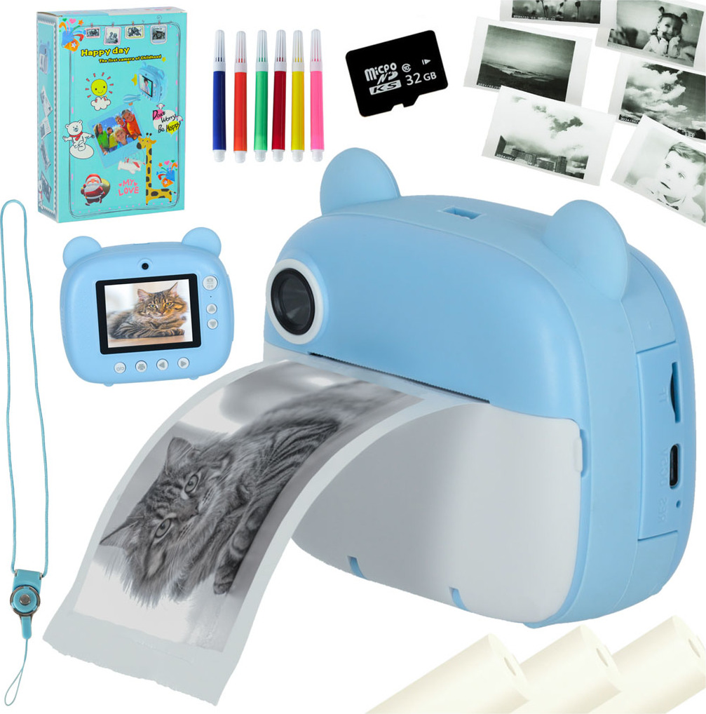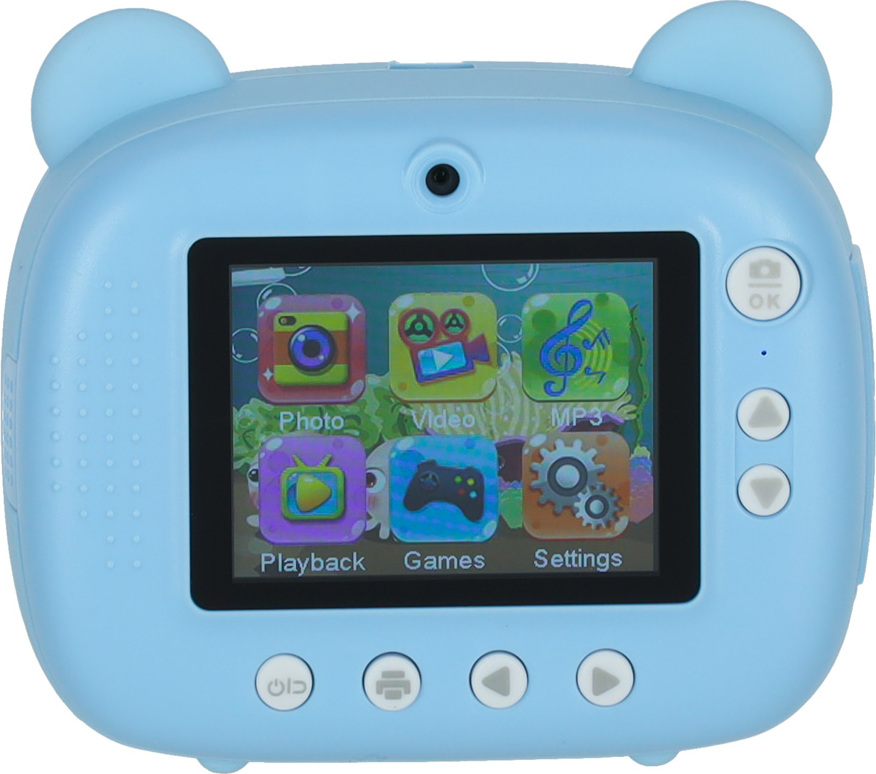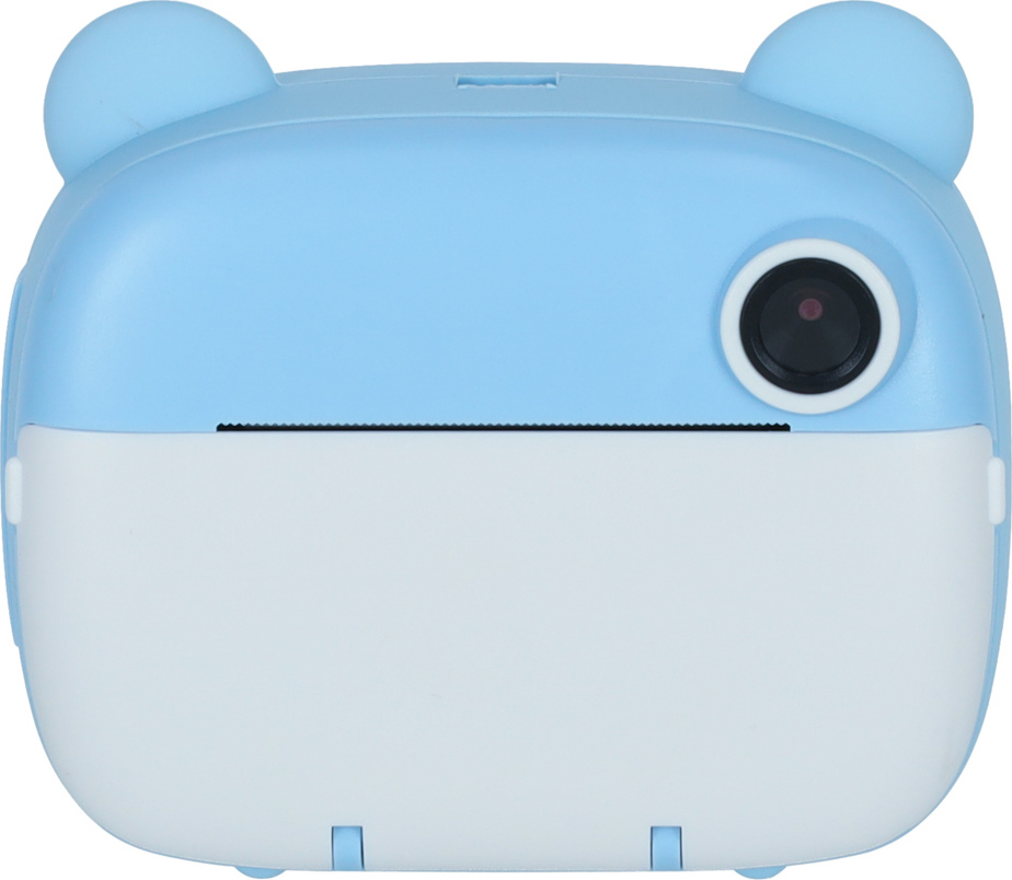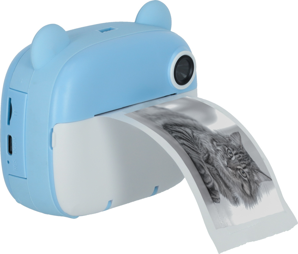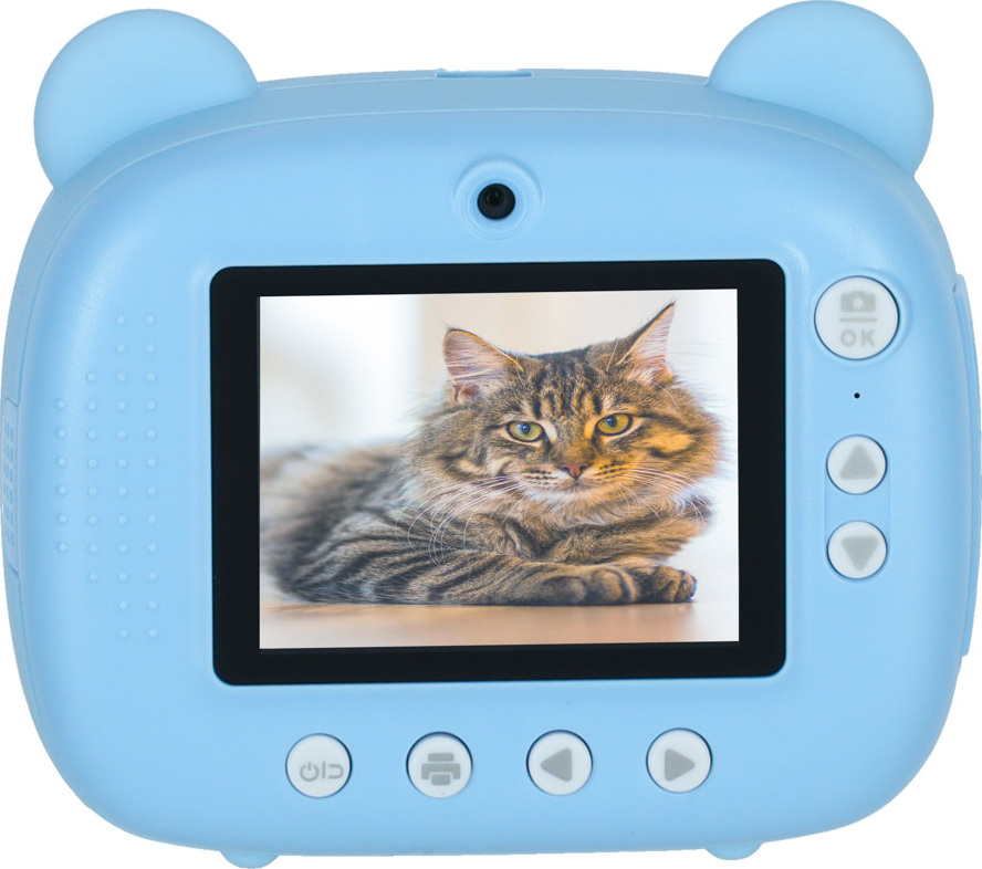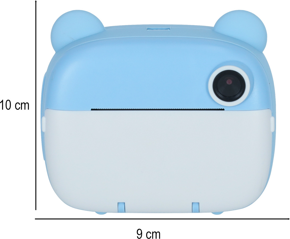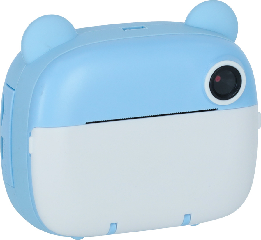 Modrý instantní fotoaparát je hračka, která podporuje kreativní hraní. Umožňuje fotografovat (dva objektivy – přední a zadní), nahrávat videa v rozlišení 1080p, přehrávat hudbu a hrát hry. Fotoaparát tiskne černobílé fotografie, které si děti mohou vybarvovat šesti přiloženými fixy. Sada obsahuje tři role papíru do tiskárny, paměťovou kartu s kapacitou 32 GB, růžovou šňůrku na krk a nabíjecí kabel USB. Fotoaparát podporuje rozvoj jemné motoriky a stimuluje kreativní myšlení dětí.