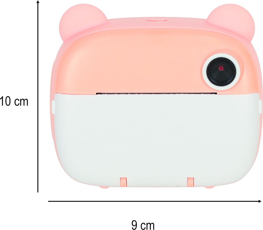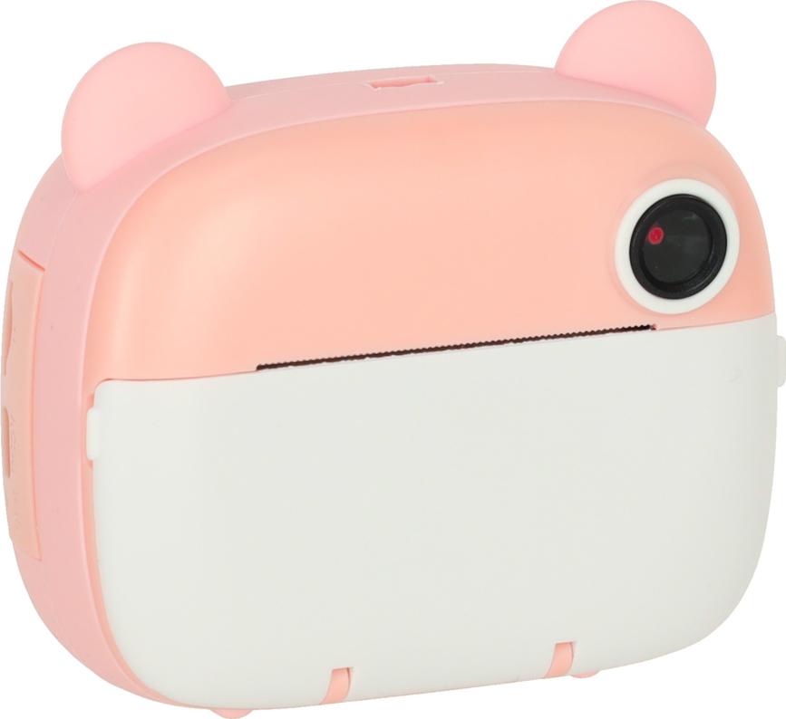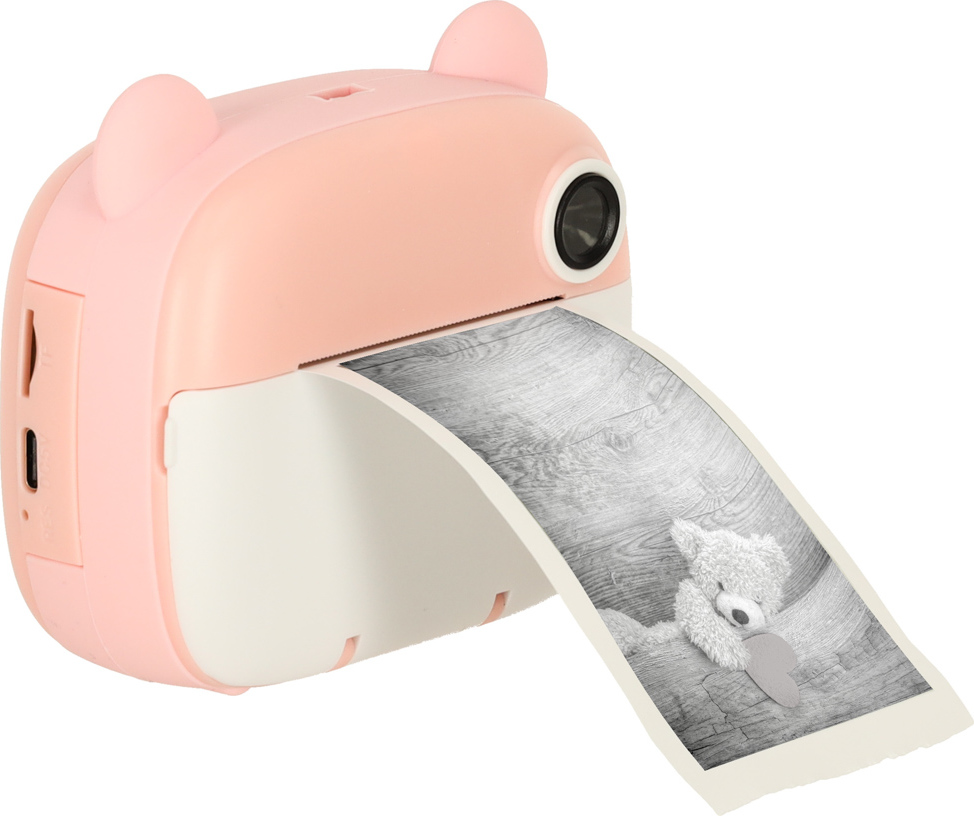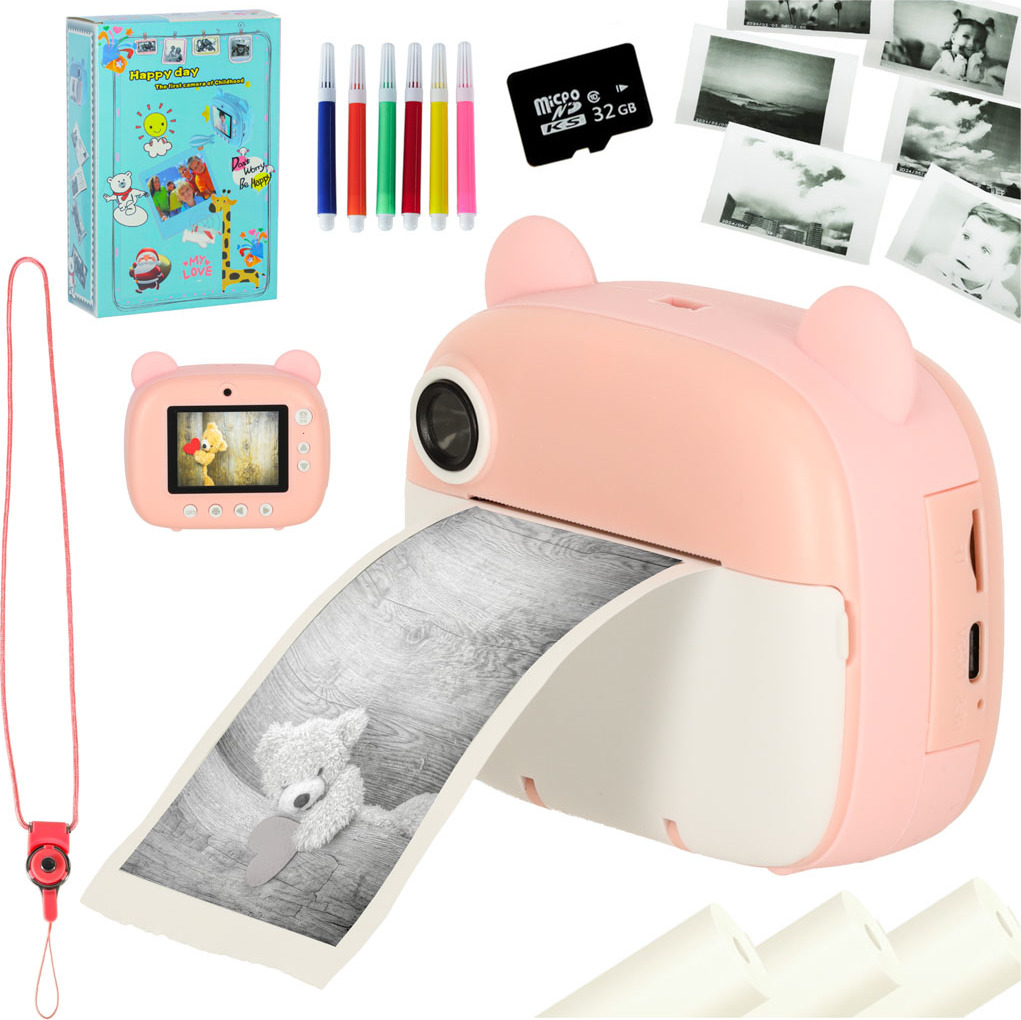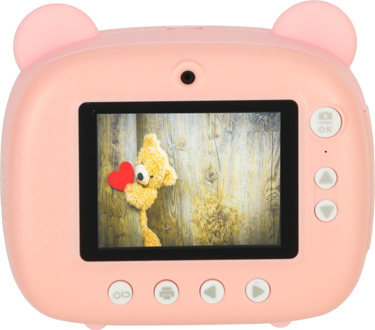 Růžový instantní fotoaparát je hračka, která podporuje kreativní hraní. Umožňuje fotografovat (dva objektivy – přední a zadní), nahrávat videa v rozlišení 1080p, přehrávat hudbu a hrát hry. Fotoaparát tiskne černobílé fotografie, které si děti mohou vybarvovat šesti přiloženými fixy. Sada obsahuje tři role papíru do tiskárny, paměťovou kartu s kapacitou 32 GB, růžovou šňůrku na krk a nabíjecí kabel USB. Fotoaparát podporuje rozvoj jemné motoriky a stimuluje kreativní myšlení dětí.
