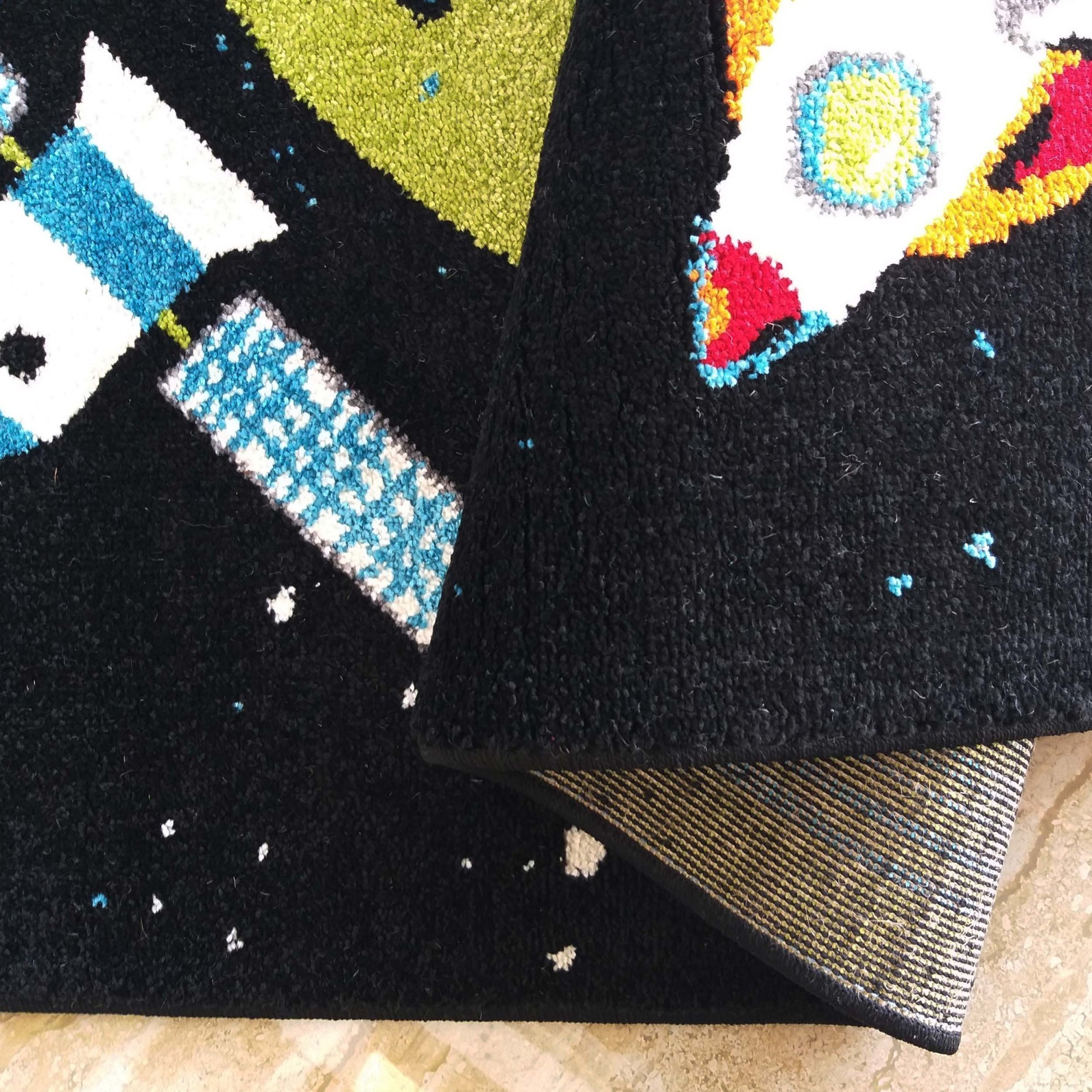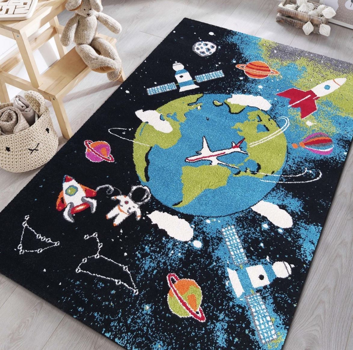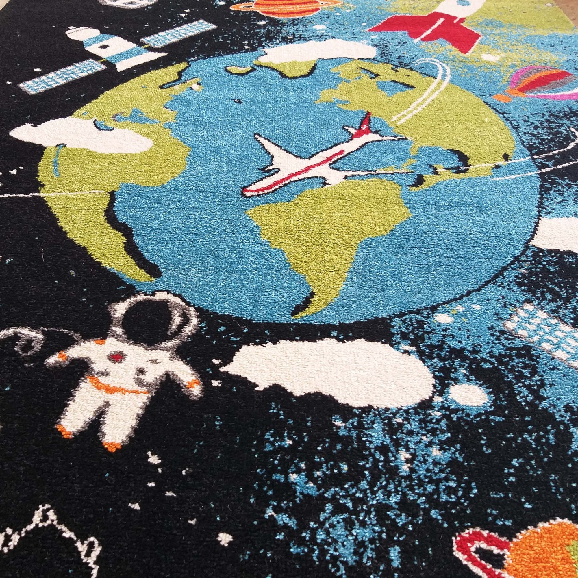 Krásný dětský koberec s motivem vesmíru si zamiluje každý malý kosmonaut a vesmírný objevitel. Předností koberce jsou krásné syté barvy odolné vůči vyblednutí. Koberec je vyrobený z pružného polypropylenového vlákna, které mu zaručuje odolnost vůči deformacím i při internivzním používání. Koberec je navíc měkký a velmi příjemný na dotek.