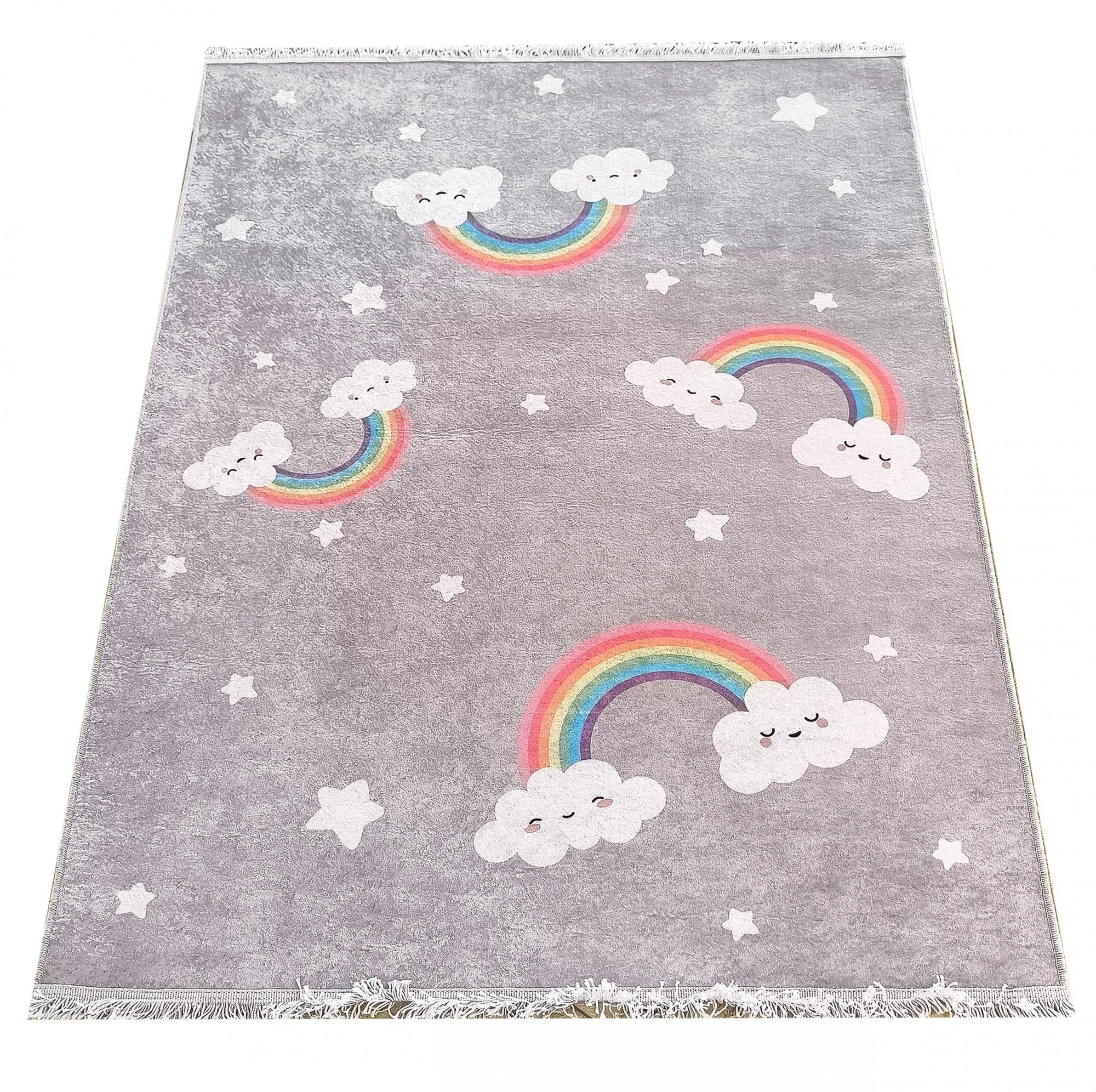 Koberec Honor New Duha je okouzlující a roztomilý koberec do dětského pokoje. Vyberte si tento model, pokud hledáte zajímavý a nekonvenční nápad na koberec do dětského pokoje! Tento dětský koberec se vyznačuje originálním barevným schématem. Krásné šedé odstíny jsou kombinovány s jemnými pastelovými růžovými, bílými, fialovými a teplými broskvovými tóny. Tento koberec bude krásným doplňkem dětského pokoje, zejména v moderním interiéru ve skandinávském stylu nebo v místnosti zařízené v bílé, šedé nebo béžové barvě.