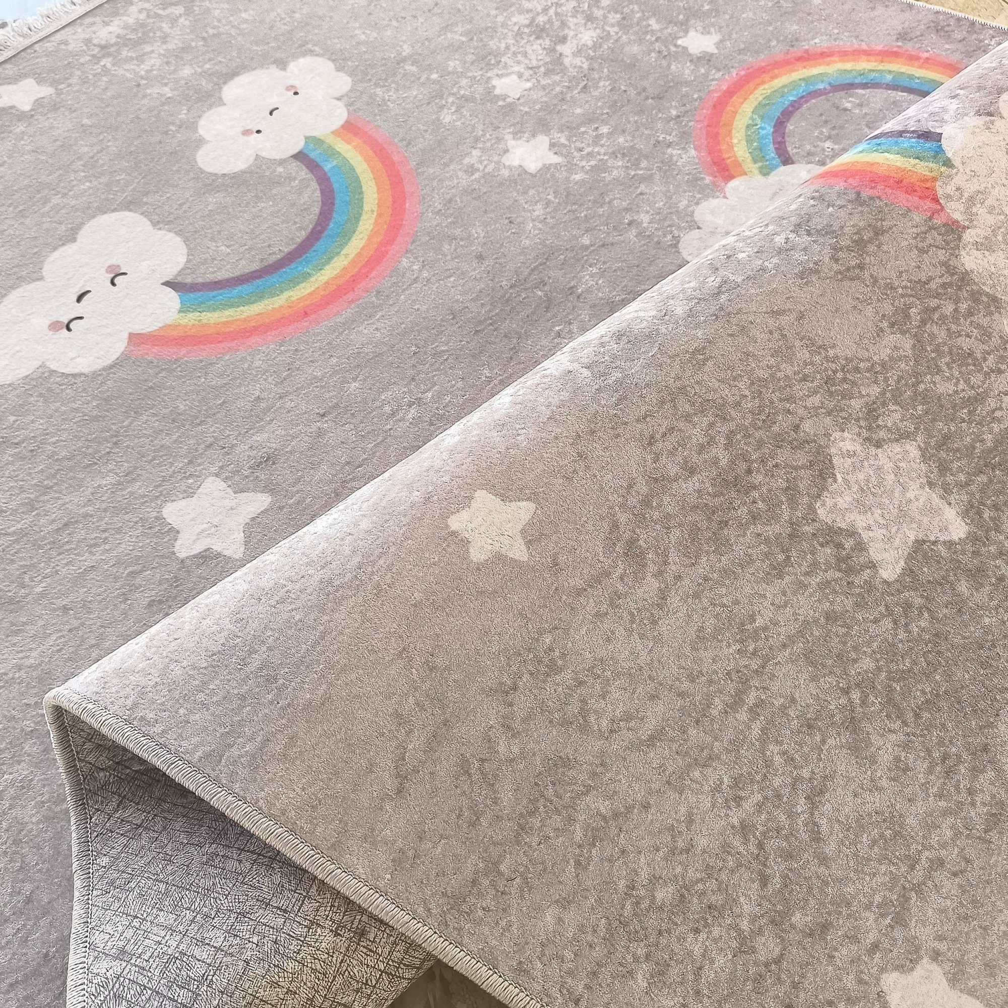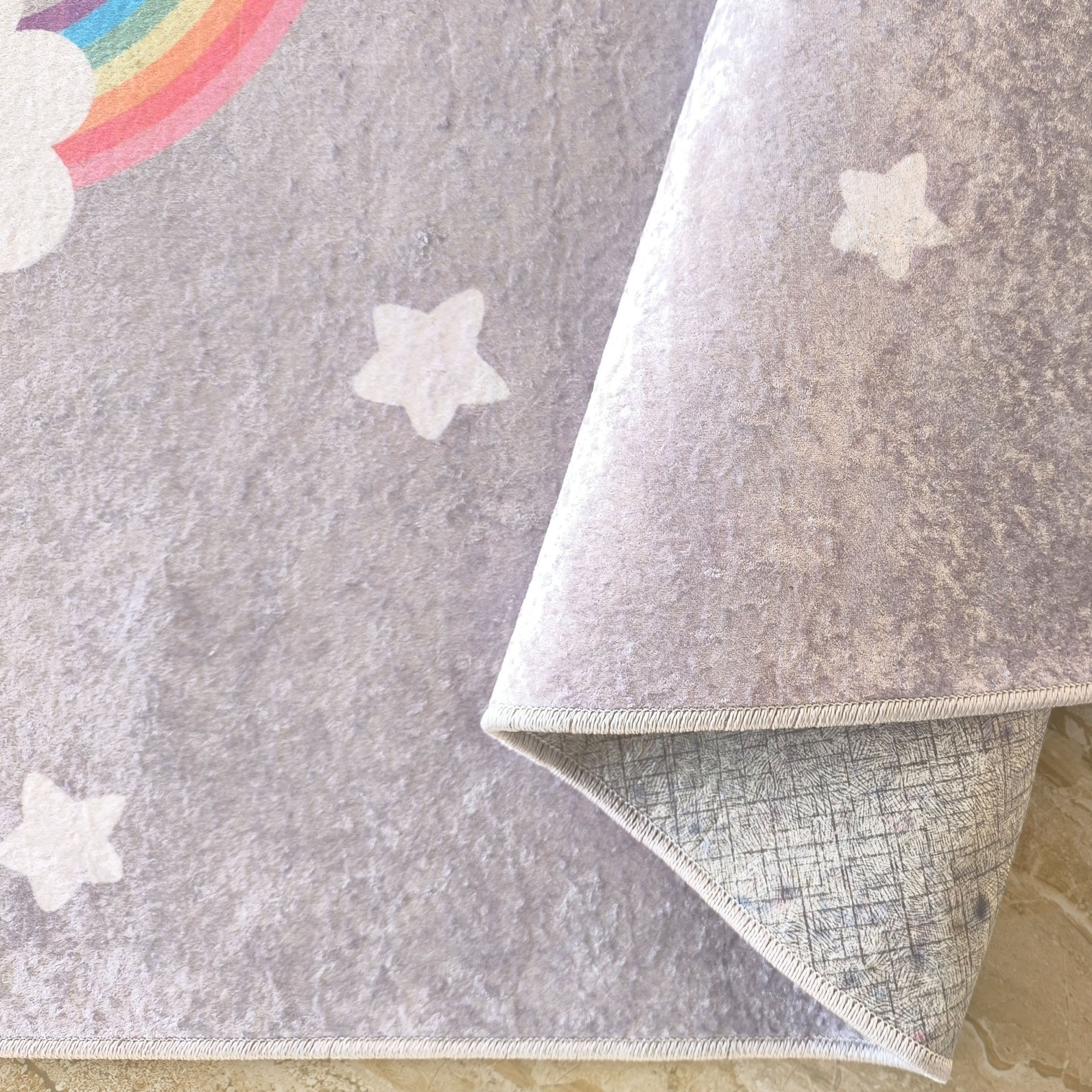 Tento dětský koberec s duhovým motivem má velkou výhodu, kterou ocení zejména dospělí. Snadno se pere v pračce, takže se snadno udržuje svěží a čistý každý den. Navíc má protiskluzovou zadní stranu, takže je bezpečný pro dětský pokoj. Tento koberec je vyroben z polyesteru. Tento materiál se podobá přírodním tkaninám, ale je výrazně pevnější a odolnější vůči mechanickému poškození, záhybům a otlakům od nábytku. Polyester je také antibakteriální a antialergický. Neuchovává prach, roztoče ani plísně. Takže si můžete být jisti, že koberec vašeho dítěte bude bezpečný pro děti s alergiemi.