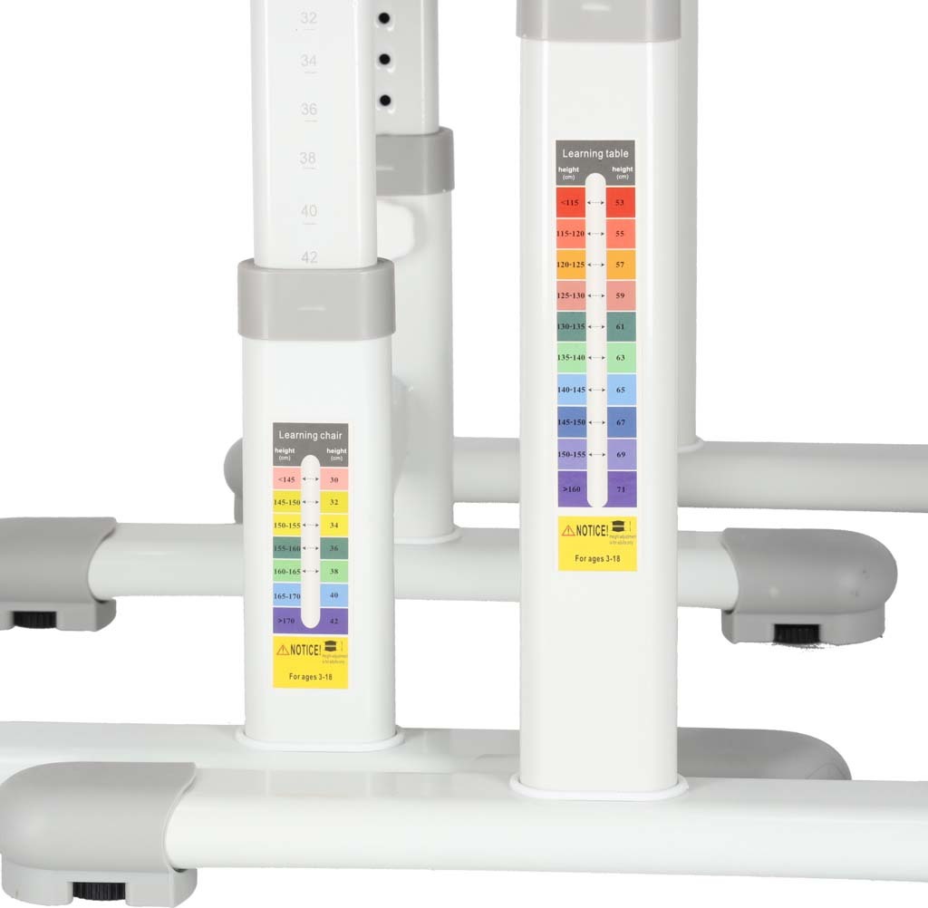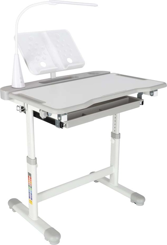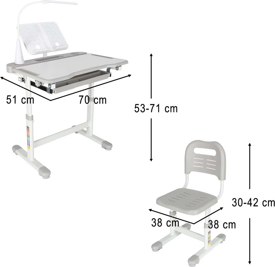 Správné nastavení stolu má významný vliv na zdraví dítěte a výškově nastavitelný dětský stůl s ním „roste“. Pomocí šroubů můžete nastavit výšku dětského stolu podle věku a výšky dítěte. Minimální výška stolu je 53 cm a maximální 72 cm. To znamená, že jej mohou používat děti školního věku, od batolat až po o něco starší děti. Nastavitelná dětská židle unese až 80 kg, takže je stabilní a praktická. Otevírací deska stolu a zásuvka pro dětský stůl s přihrádkami umožňují uložení potřeb na jednom místě. Rozměry držáku na knihy – 35,5 cm x 26 cm – odpovídají formátu B4. Snadno se do něj vejde kniha nebo sešit A5 (14,8 cm x 21 cm) nebo B5 (17,6 cm x 25 cm) a také list A4 na šířku (21 cm x 29,7 cm). Stůl je navíc dodáván s LED lampou, kterou lze připevnit k desce stolu. LED diody vyzařují studené nebo teplé světlo, které lze nastavit podle denní doby a individuálních preferencí. Stůl má také připevnitelnou rukojeť pro zavěšení batohu, tašky nebo příslušenství.