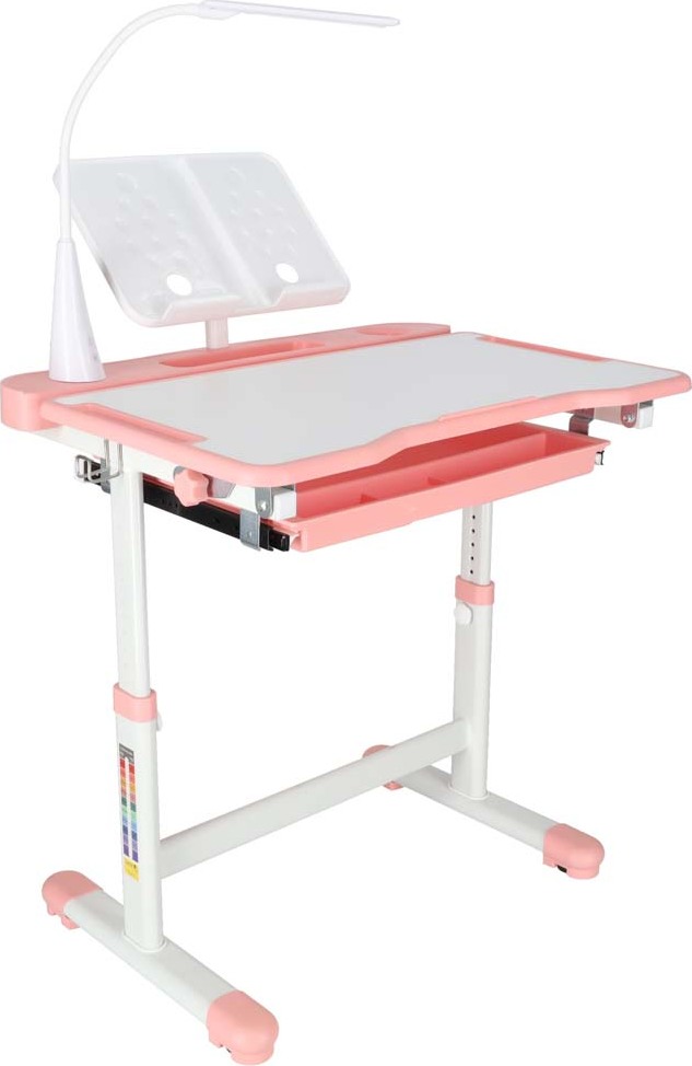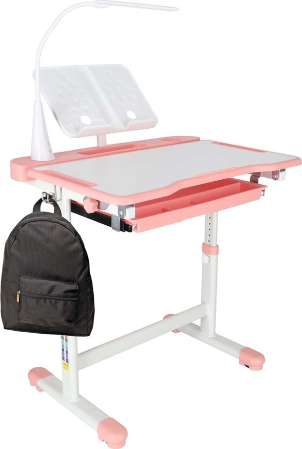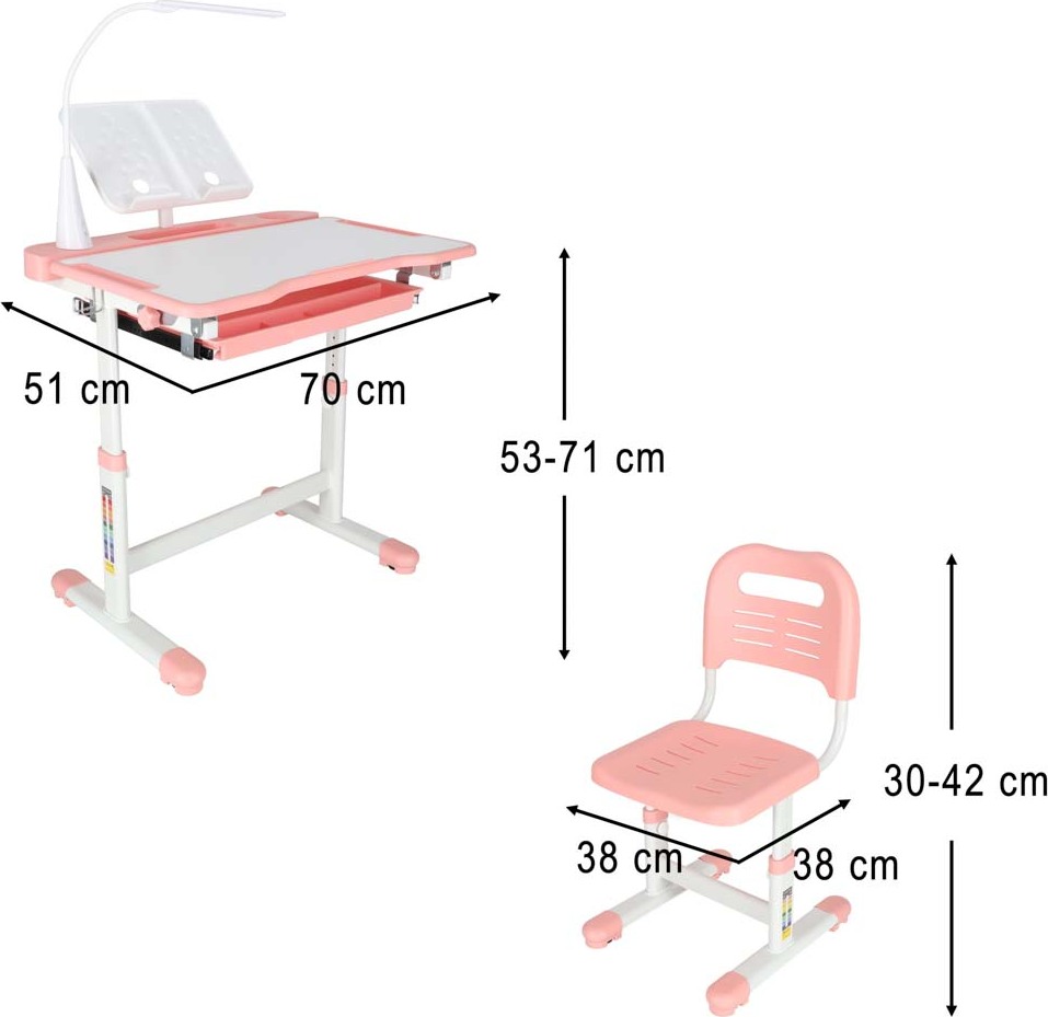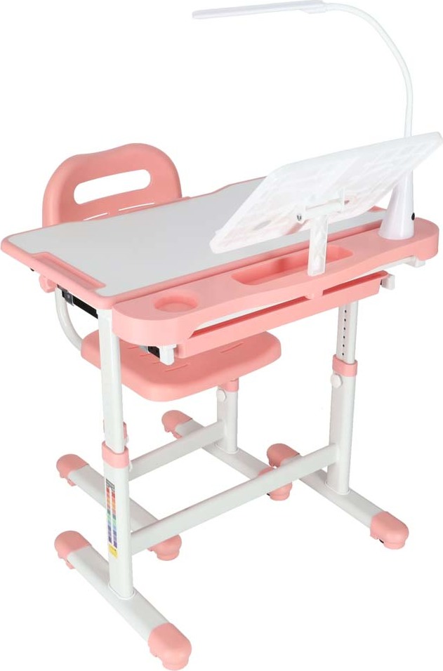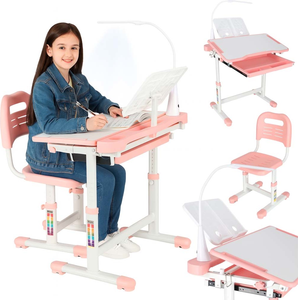 Správné nastavení stolu má významný vliv na zdraví dítěte a výškově nastavitelný dětský stůl s ním „roste“. Pomocí šroubů můžete nastavit výšku dětského stolu podle věku a výšky dítěte. Minimální výška stolu je 53 cm a maximální 72 cm. To znamená, že jej mohou používat děti školního věku, od batolat až po o něco starší děti. Nastavitelná dětská židle unese až 80 kg, takže je stabilní a praktická. Otevírací deska stolu a zásuvka pro dětský stůl s přihrádkami umožňují uložení potřeb na jednom místě. Rozměry držáku na knihy – 35,5 cm x 26 cm – odpovídají formátu B4. Snadno se do něj vejde kniha nebo sešit A5 (14,8 cm x 21 cm) nebo B5 (17,6 cm x 25 cm) a také list A4 na šířku (21 cm x 29,7 cm). Stůl je navíc dodáván s LED lampou, kterou lze připevnit k desce stolu. LED diody vyzařují studené nebo teplé světlo, které lze nastavit podle denní doby a individuálních preferencí. Stůl má také připevnitelnou rukojeť pro zavěšení batohu, tašky nebo příslušenství.