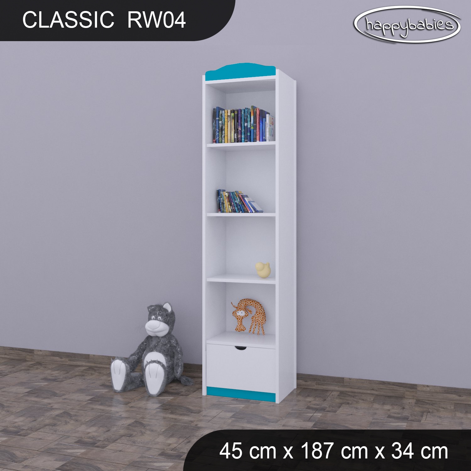 Skvělým doplňkem ke skříni či komodě je vysoký regál. Nabízí mnoho úložného prostoru jak otevřeného, tak i uzavřeného. Kombinuje totiž otevřené police se šuplíkem ve spodní části regálu. Nabízíme několik barevných provedení, jejichž základem je vždy bílá. Barevný element najdete na soklu, šuplících nebo na zadním čele. Nábytek je vyroben z 18mm laminované desky. Okraje jsou ukončeny okrajem z PVC / ABS, který je chrání před mechanickým poškozením a vlhkostí. Místo ruček slouží k otevírání šuplíků a skříněk obloukové výřezy.
