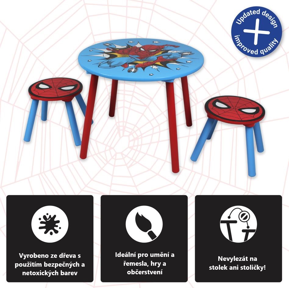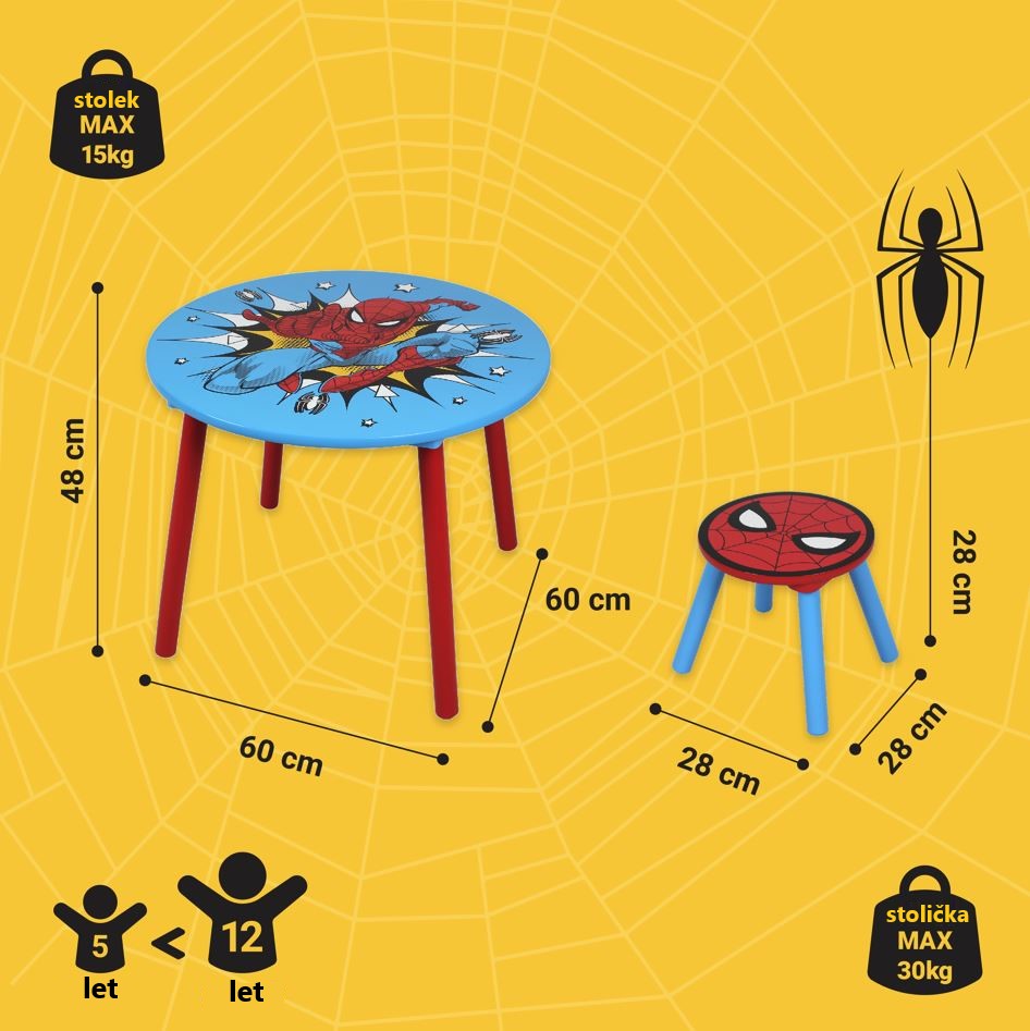 Pokud je Spiderman oblíbeným superhrdinou vašeho dítěte, pak je tato sada dětského stolu a stoliček určena právě jemu. Sada stolečku a židliček se vyznačuje ergonomickým vzhledem a sytými barvami v oblíbené kombinaci modré a červené. Stoleček mohou děti využít k tvoření, malování a kreslení. Nábytek je vyroben z kvalitních MDF desek o síle 15 mm s lesklou povrchovou úpravou.