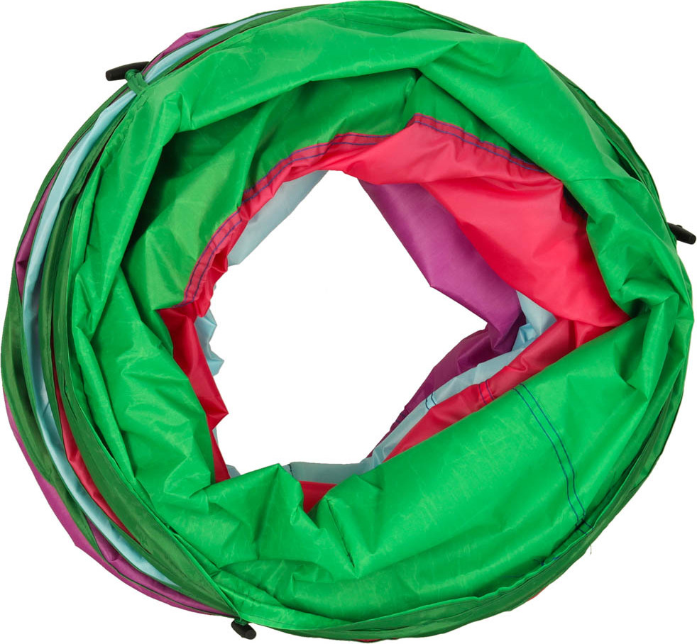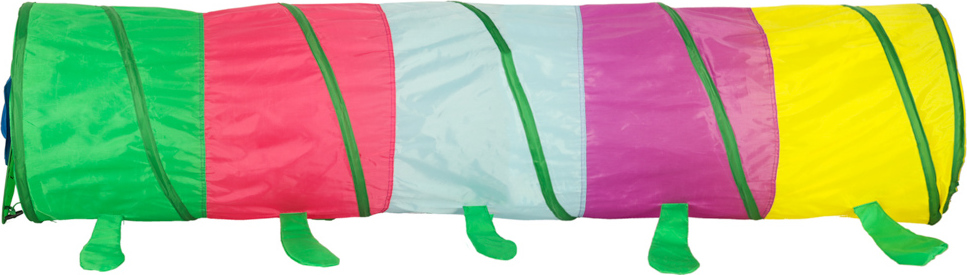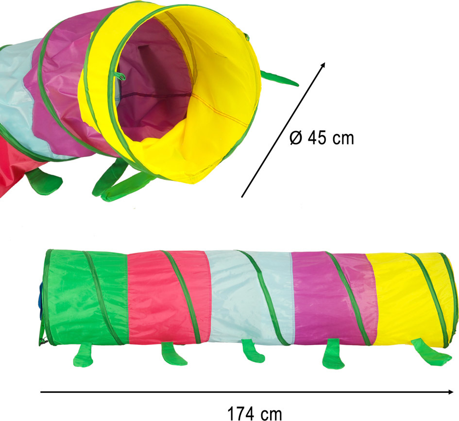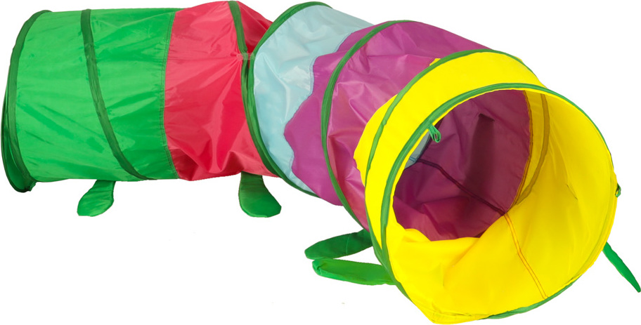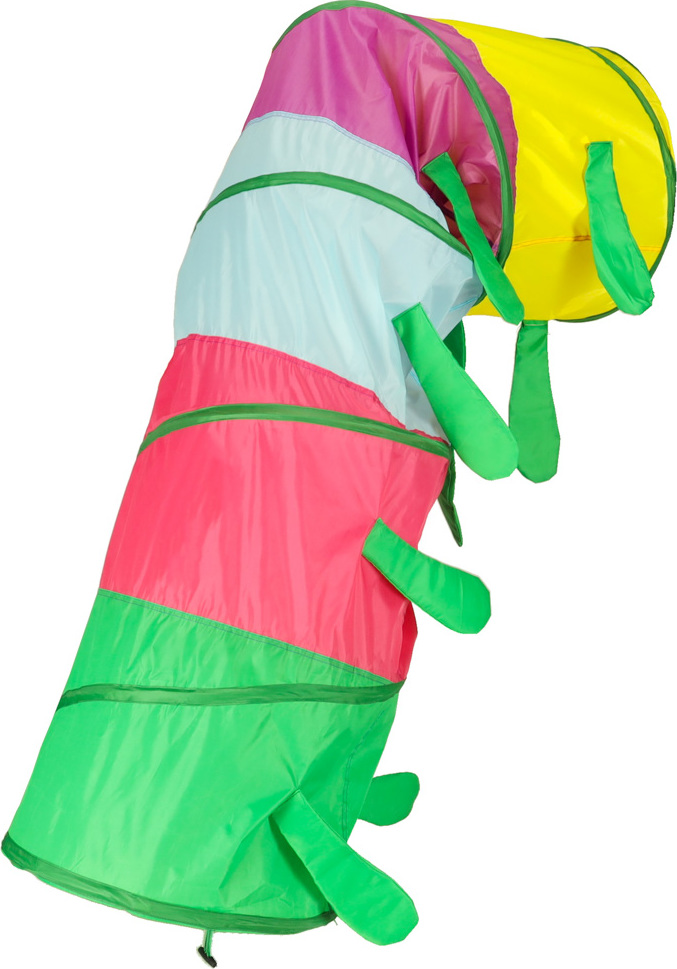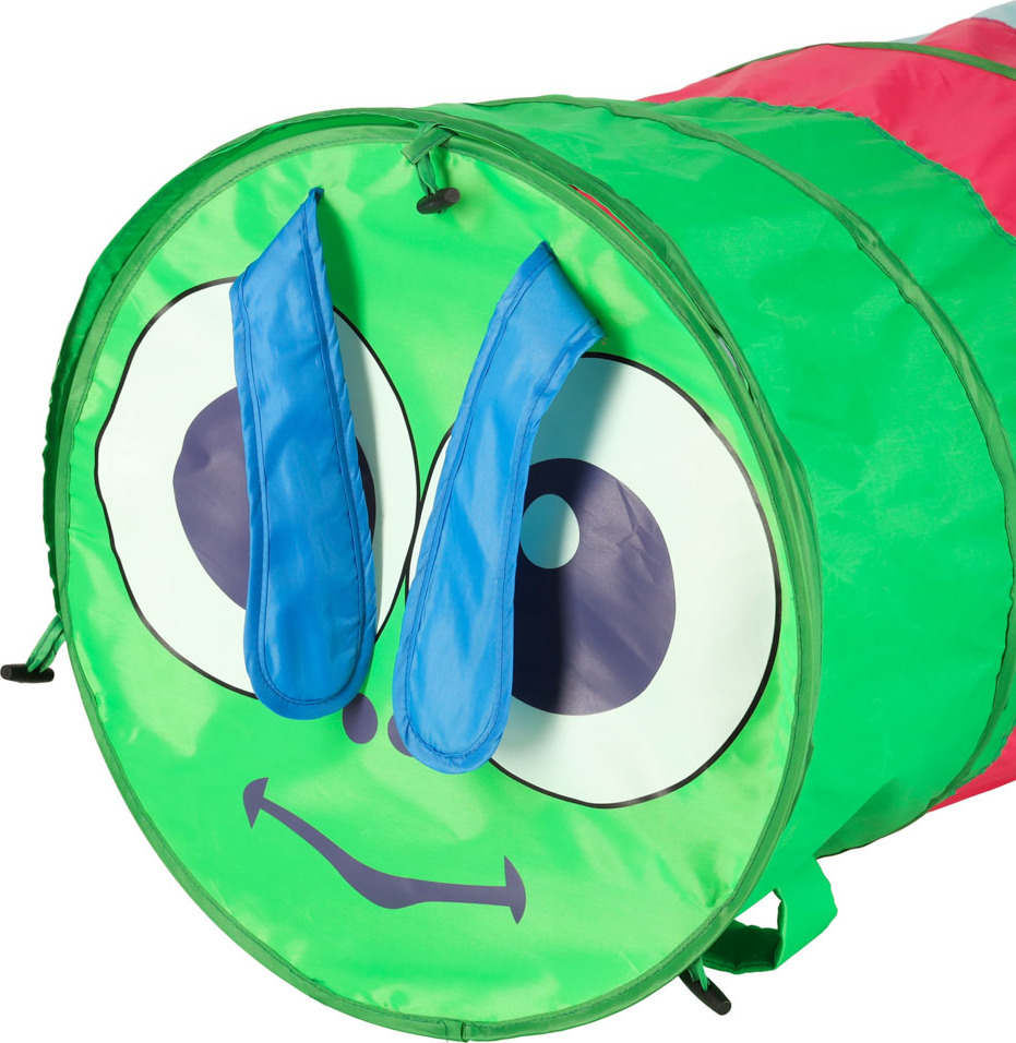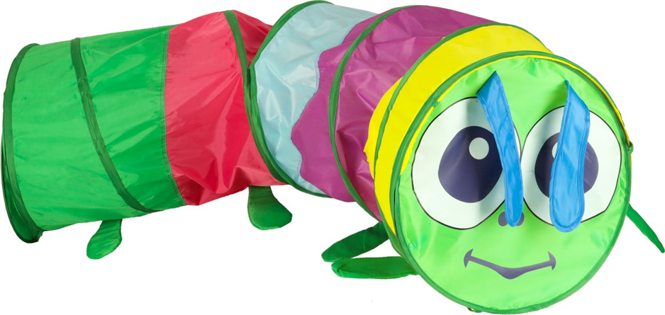 Tunel lze využít mnoha způsoby. K housence můžete připevnit hlavu a ocas nebo nechat průchody otevřené. Chytrá samoskládací konstrukce a praktický kufřík na přenášení umožňují tunel rozložit v interiéru i exteriéru.