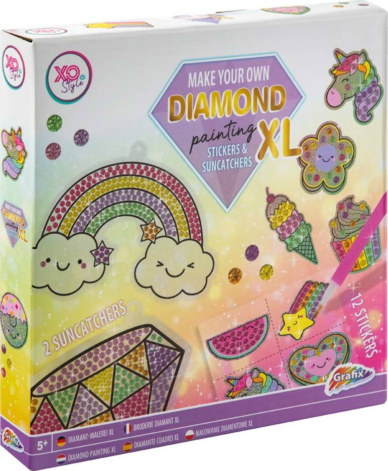 2 listy samolepek (12ks), 2ks lapače slunce vč.závěsu, barevné kamínky označované jako „diamanty“, aplikátor, zásobník s nálevkou, vosková podložka.