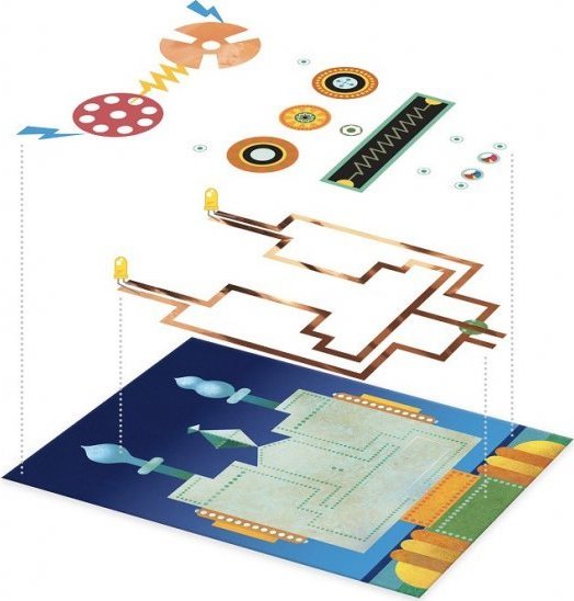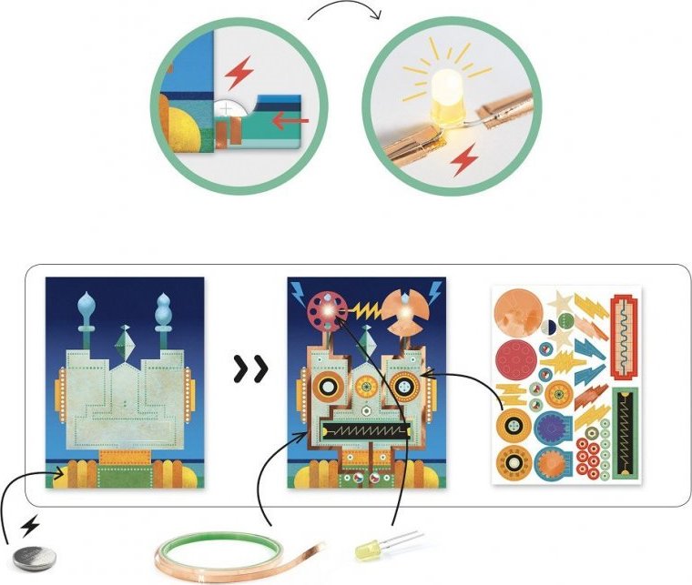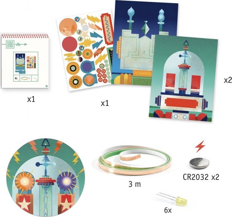 Světélkující obrázky od výrobce Djeco jsou propojením umění a technologie. Kreativní sada děti zábavnou formou přibližuje základům fyziky. V první řadě děti vytváření elektrický obvod pomocí přiložené vodící pásky. Následně je třeba umístit malé svítivé diody na své místo. a samozřejmě obrázek dozdobit samolepkami. V posledním kroku je třeba přidat knoflíkovou baterii a obrázek se pak může jedním dotykem rozzářit . Rozměr obrázku je cca 15 x 20 cm. Obsah balení: 2 obrázky, 3 metry vodící pásky 6 svítících diod 2 CR2032 baterie 1 arch samolepek Vhodné pro děti od 8 let.Vlastnosti
