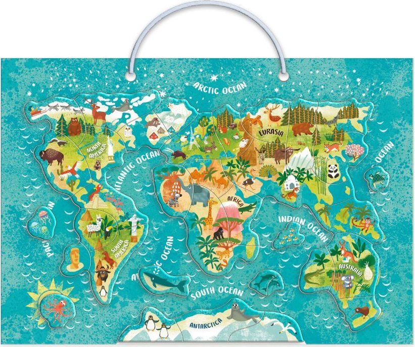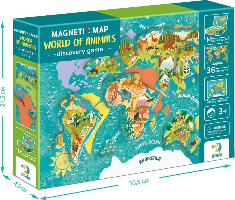Magnetická hra Mapa světa se zvířaty je ideální vzdělávací pomůckou, díky které se vaše děti naučí poznávat svět přírody a rozmanitost zvířat na různých kontinentech. Balení obsahuje 36 magnetických prvků s obrazy zvířat. Rozměr podkladového obrázku je cca 30 x 21 cm. Krabici lze využít i jako držák magnetické tabule. Tabulka má šňůrku na pověšení. Magnetické hry jsou novým formátem vzdělávacích her. Mapa obsahuje popisky v anglickém jazyce.