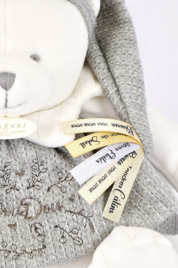 Plyšové mládě ledního medvídka je ideálním dárkem pro děti již od narození. Je navržen tak, aby jemně stimuloval smysly miminka a podporoval jeho přirozenou zvídavost. Medvídek má šedou čepičku zdobenou saténovými stuhami s láskyplnými vzkazy ve francouzštině, které každému mazlení dodávají ještě něžnější nádech. Tělíčko medvídka je vyrobeno z hebkého materiálu příjemného na dotek a zdobí ho jemná výšivka značky Doudou. Pro rozvoj smyslů a jemné motoriky nabízí medvídek spoustu podnětů – šustivý papír v tlapkách, plastový úchopový kroužek a chrastítko uvnitř tělíčka medvídka. Díky kvalitním, měkkým materiálům a jemným, trendovým barvám je tento medvídek ideální volbou pro malé děti, kterým přináší pocit bezpečí, pohodlí a nekonečného mazlení.