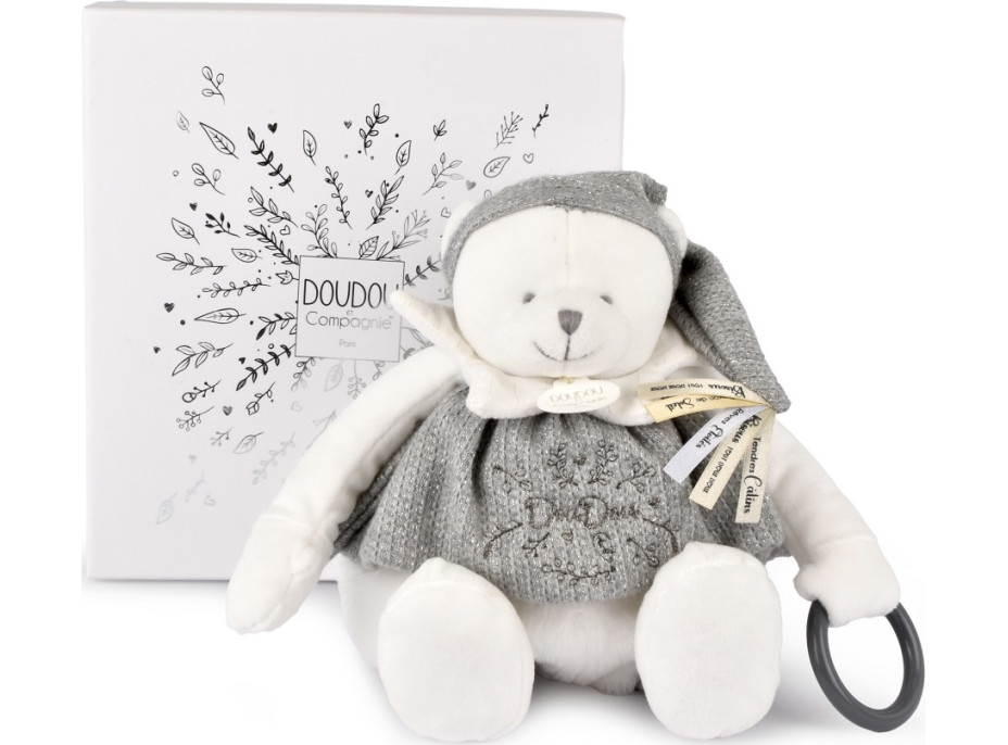 Doudou Dárková sada Plyšový lední medvídek s kroužkem 30 cm šedý