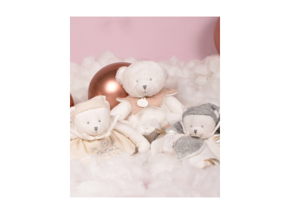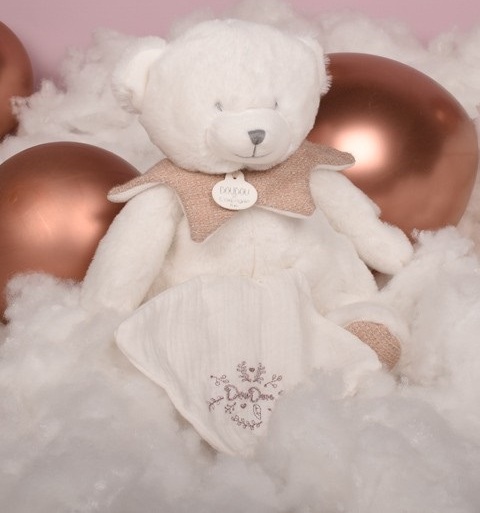 Plyšový medvídek je ideálním dárkem pro děti již od narození. Součástí medvídka je měkoučká dečka, která je skvělá k mazlení a může pomoci miminku snadněji usnout. Dečku lze jednoduše schovat do bříška medvídka, což je praktické při cestování nebo ukládání. Je ozdobená jemnou výšivkou značky Doudou a saténovými stuhami s láskyplnými vzkazy ve francouzštině, které dodávají každému mazlení ještě něžnější pocit. Medvídek má stylové růžové srdíčko na tlapce, roztomilý růžový límeček pod krkem a hebké růžové tlapky, které mu dodávají něžný a přátelský vzhled. Díky jemným, trendovým barvám a kvalitním, hebkým materiálům je ideální pro malé děti, kterým přináší pocit bezpečí a pohodlí. Perfektní tip na dárek, který potěší a zároveň stimuluje smysly Vašeho miminka.