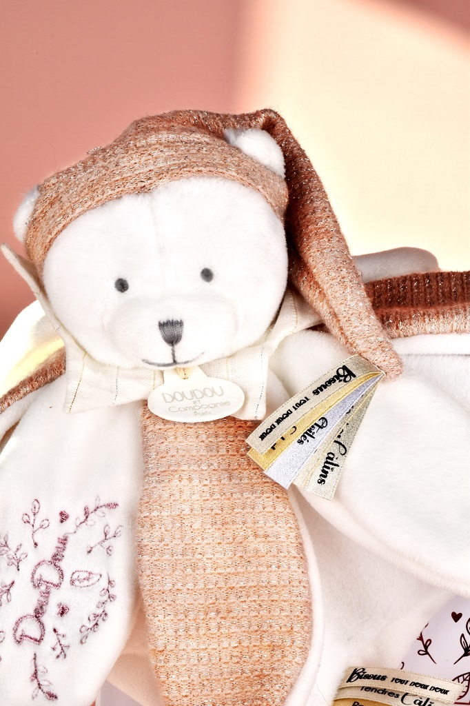 Doudou Dárková sada Plyšový muchláček medvídek s čepičkou 25 cm růžový