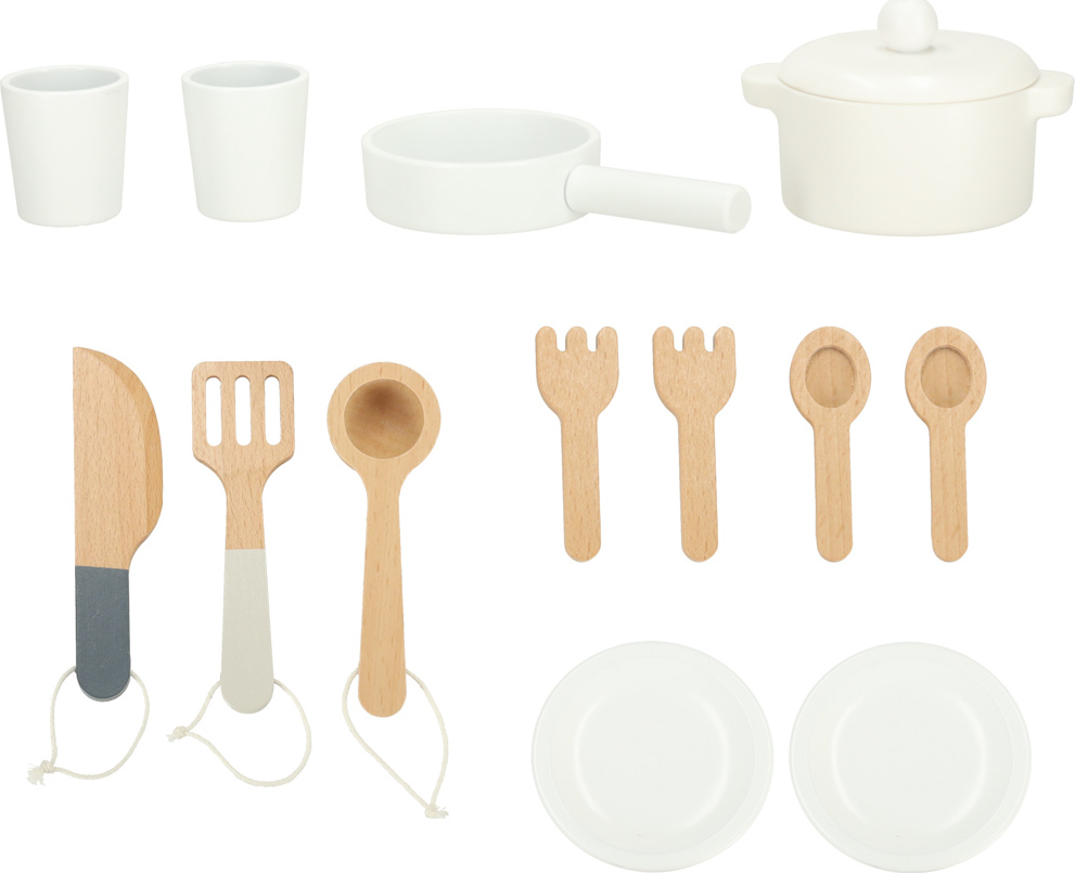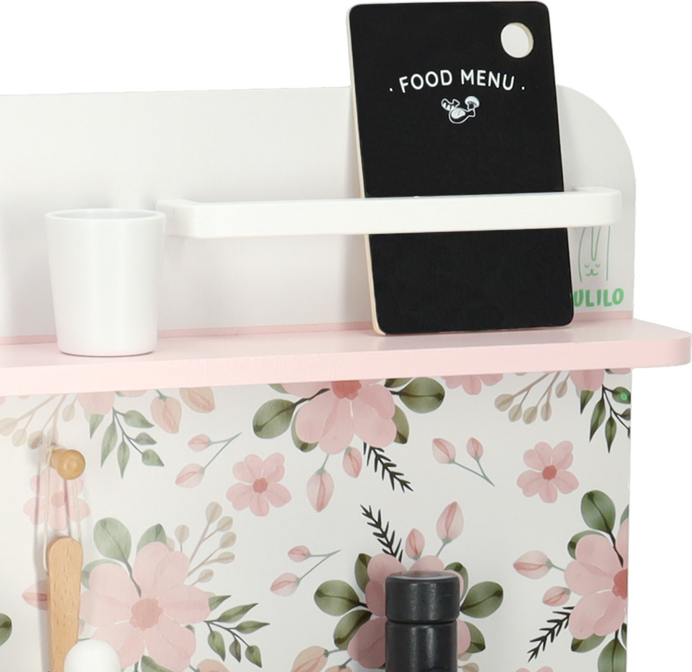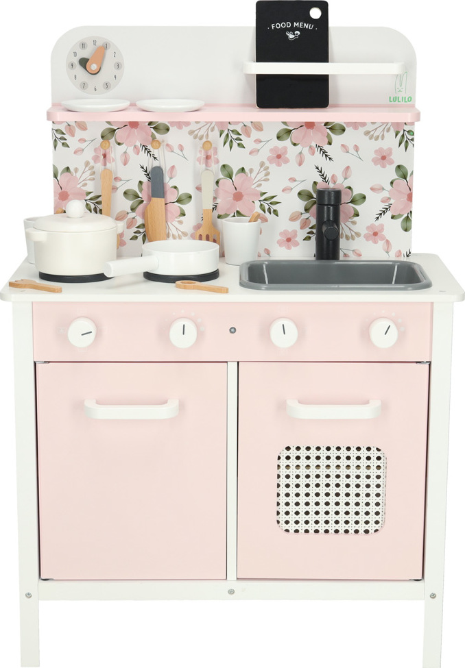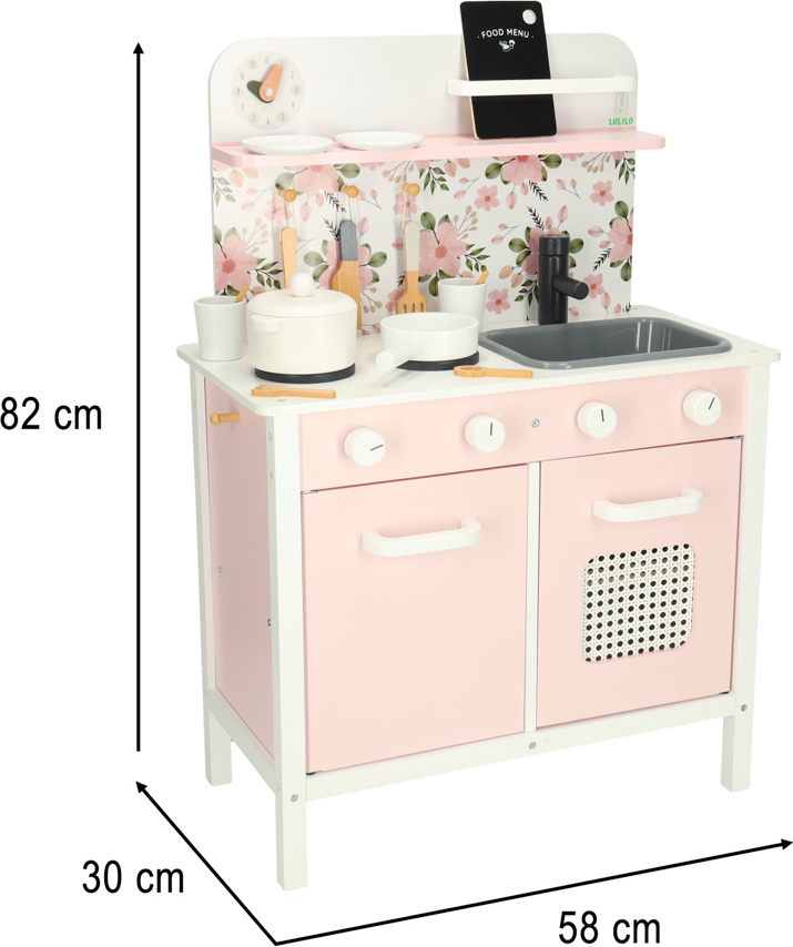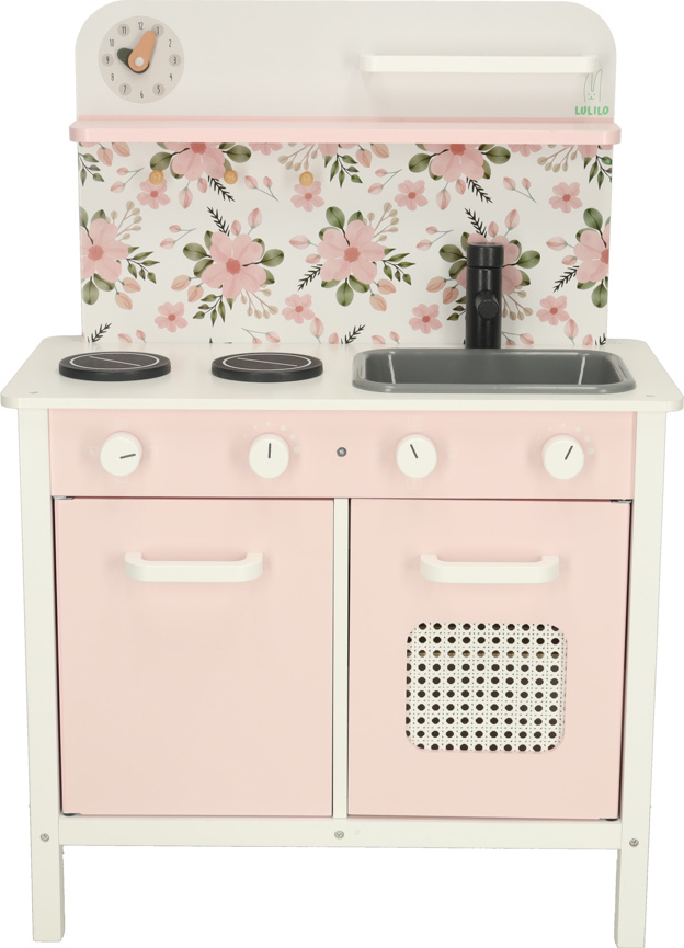 Dřevěná kuchyňka FLORO LULILO je hračkou pro malé kuchaře a zároveň stylovým doplňkem dětského pokoje. Kuchyňka je vybavena dvěma skříňkami, z nichž jedna může sloužit jako trouba, s poličkou a plastovým dřezem. Sada obsahuje široký výběr kuchyňských doplňků (hrnec, pánev, dva talíře, dva hrnky, příbory a kuchyňské náčiní), které hře dodávají realistický nádech. Čtyři otočné knoflíky poskytují interaktivní prvek, zatímco tabule s křídou umožňuje psaní receptů nebo nákupních seznamů (křída není součástí balení). Kuchyňka je v pastelových růžových a bílých barvách a s květinovým vzorem. Tato hračka dokonale podporuje rozvoj fantazie, kreativity a manuální zručnosti.