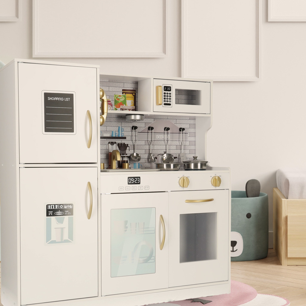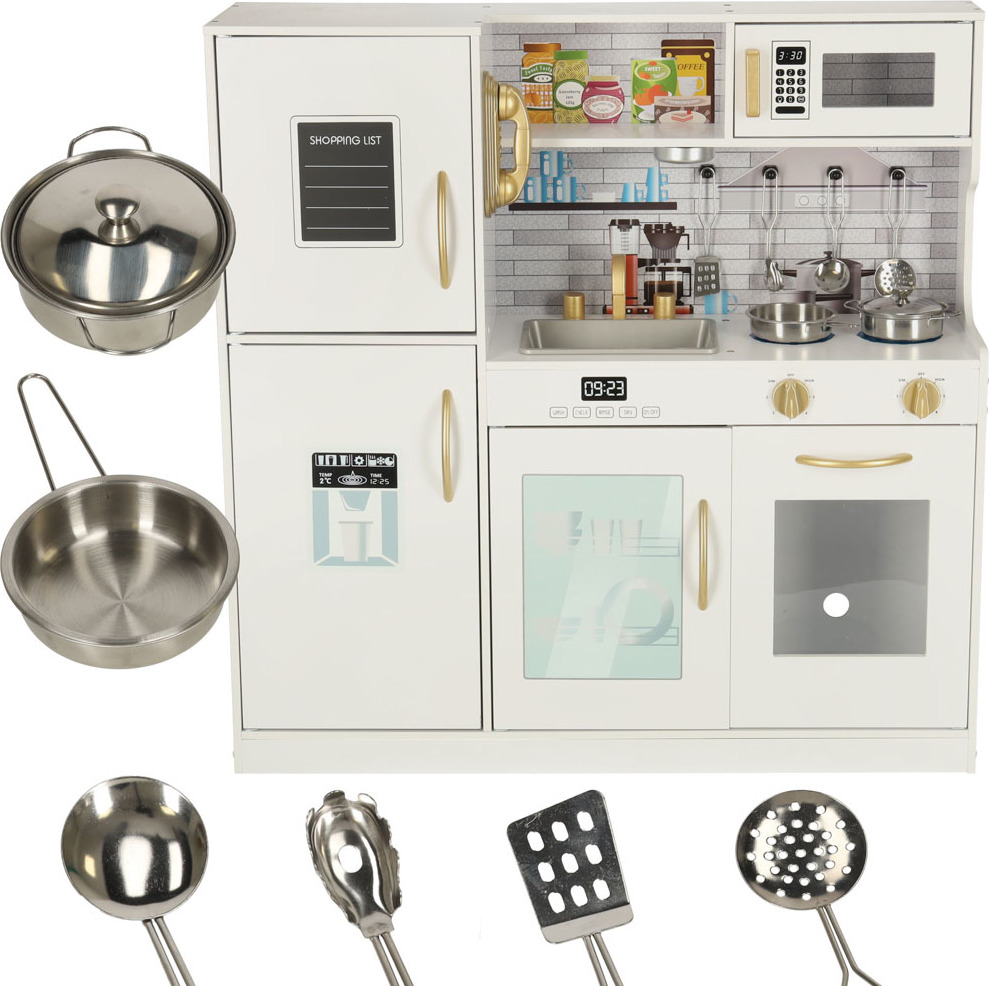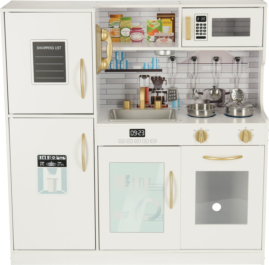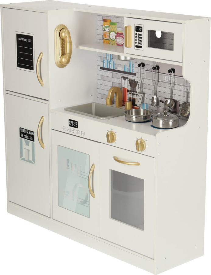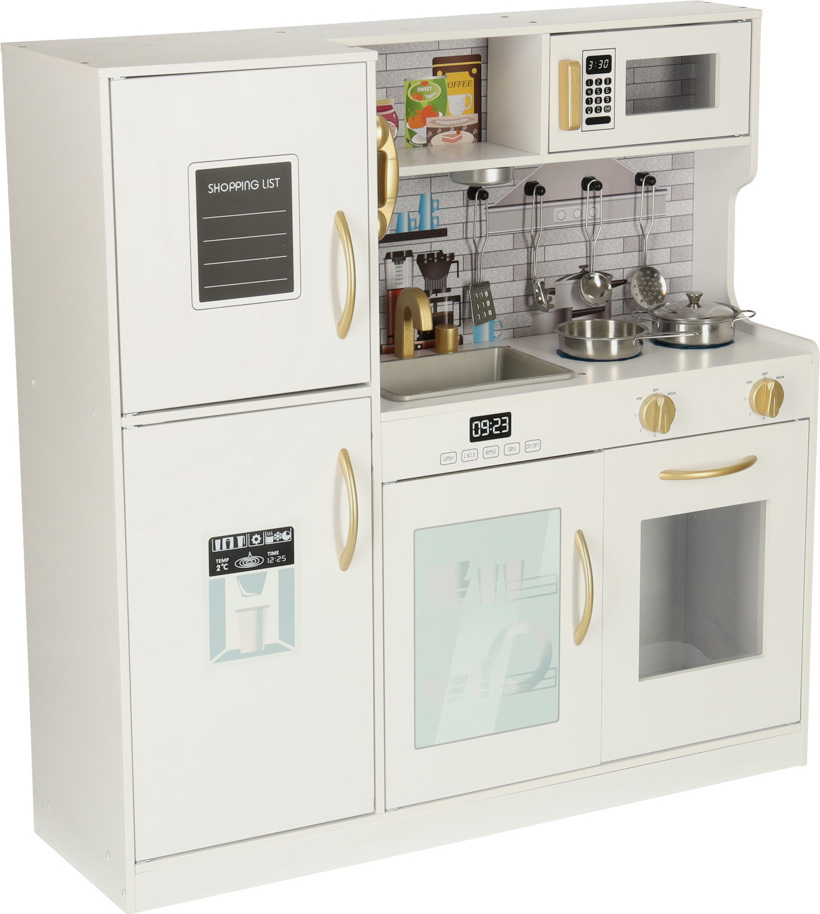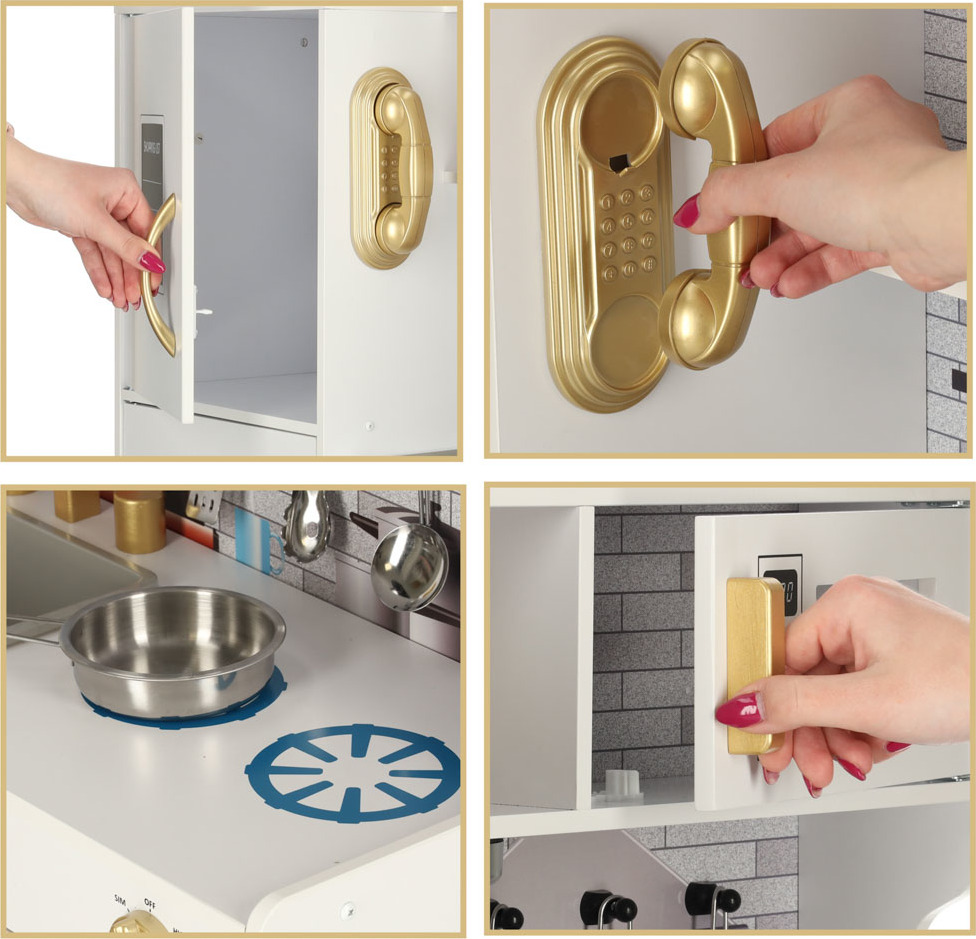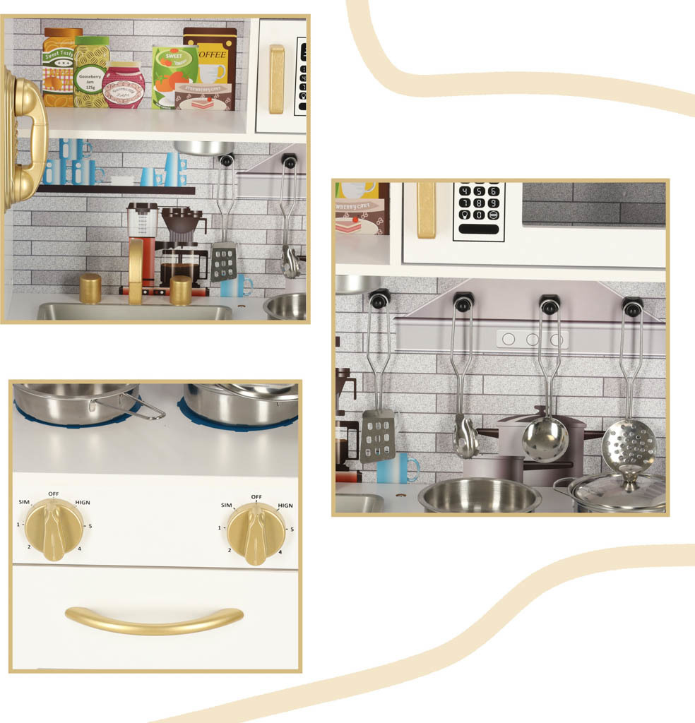 Bílá barva kuchyňky se zlatými prvky dokonale splyne s každým dětským pokojem a poskytne mu nejen prostor na hraní, ale také výraznou dekoraci. Kuchyňka byla vyrobena z masivního a hladce broušeného dřeva, takže si můžete být jisti, že vydrží mnoho vaření, které vaše ratolest uspořádá. A odolné budou i kovové doplňky.